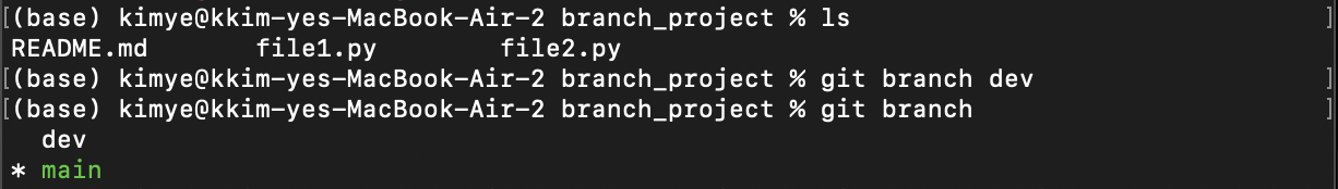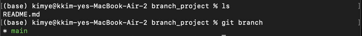 이라는 local branch 목록을 보여주고 있는데 기본값으로 main이 하나가 있고, *는 현재 여기를 HEAD가 가르키고 있으며 메인 branch 상에 머무르고 있다라고 보여주고 있는거다.