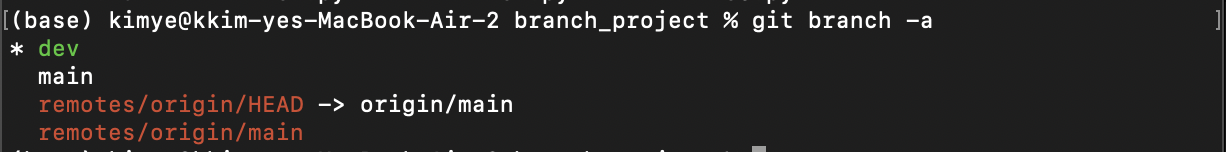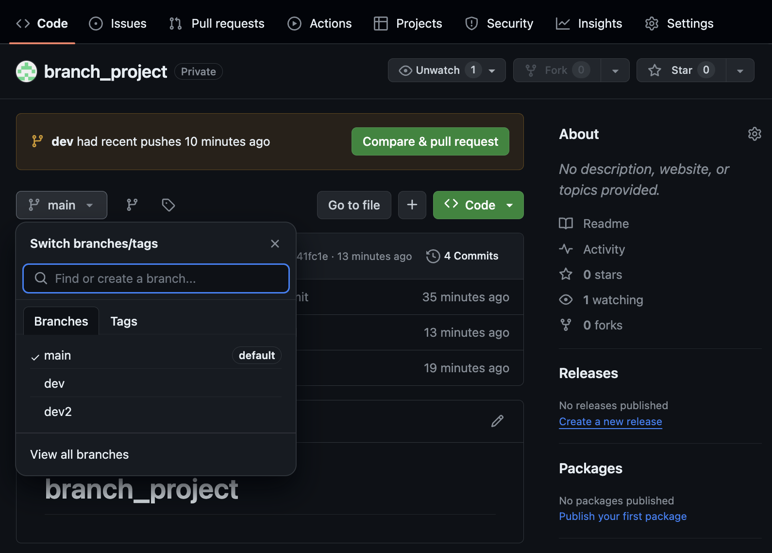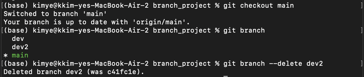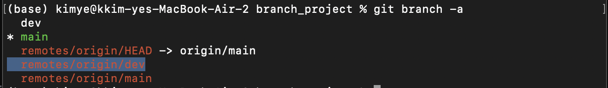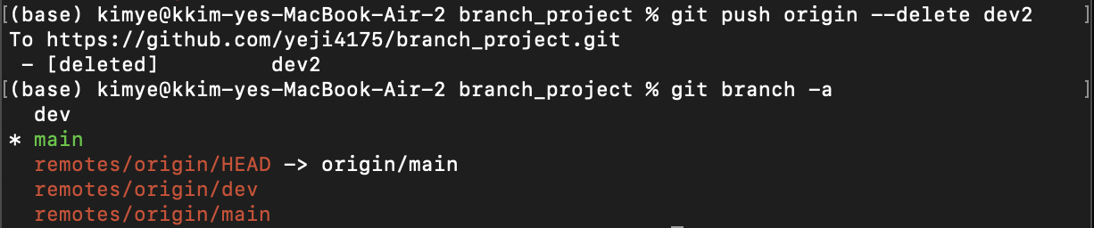 GitHub에서 branch_project를 다시 새로고침하면 remote repository에도 dev2 삭제가 반영되어있는걸 확인할 수 있다.
