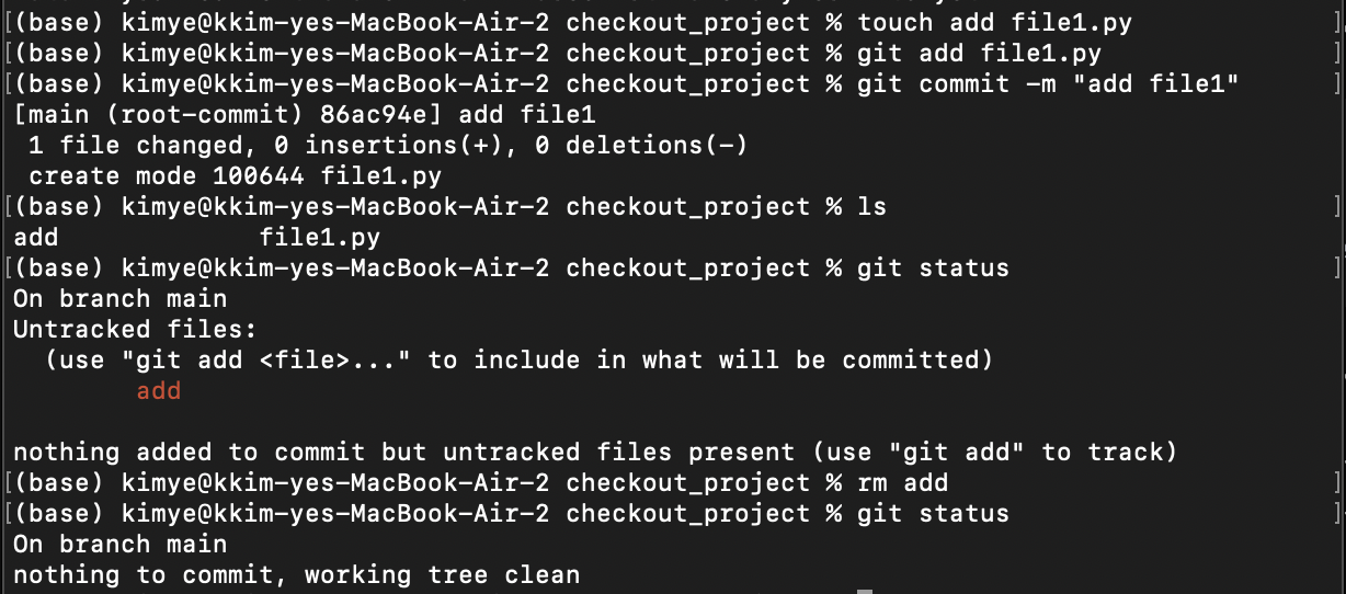 만약 아래와 같이 빈 파일을 add, file1.py로 잘못 생성하면add라는 파일은 unstaged 상태이기에 바로 지워줄 수 있다.