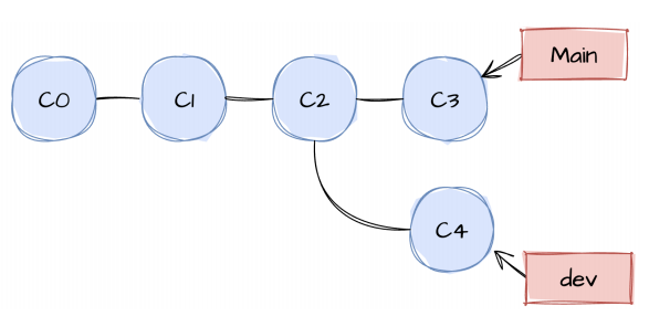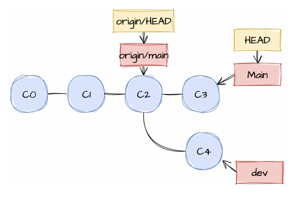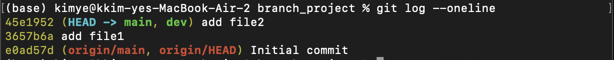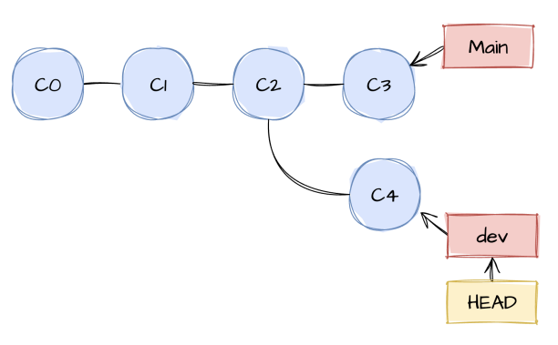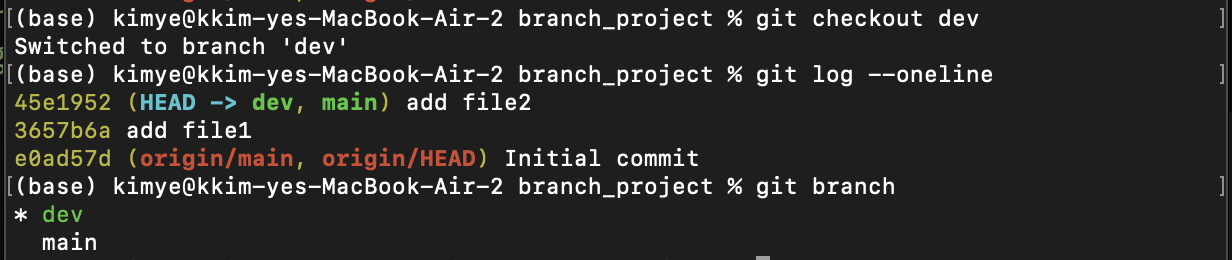 명령을 하는 순간 main을 가리키던 HEAD는 dev를 가리키게 된다.
