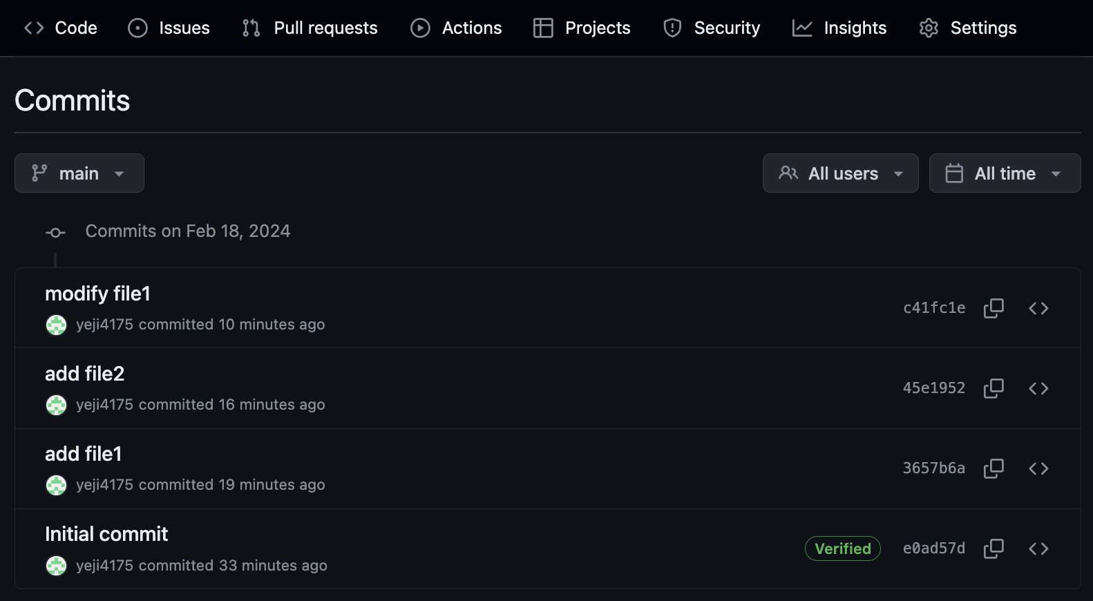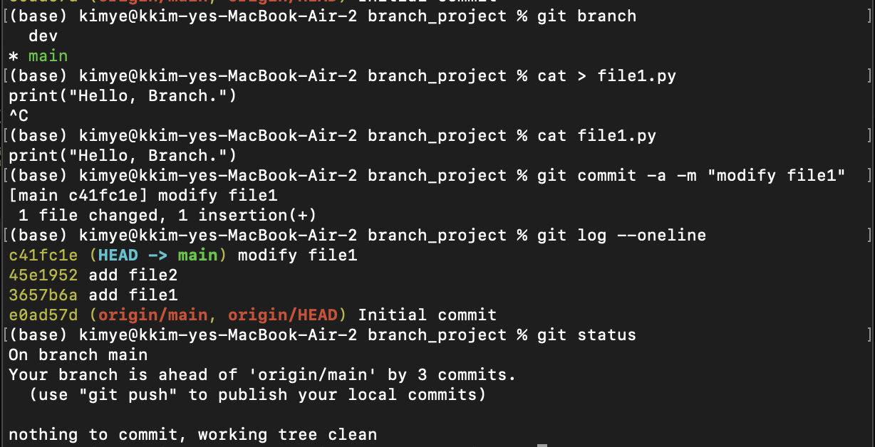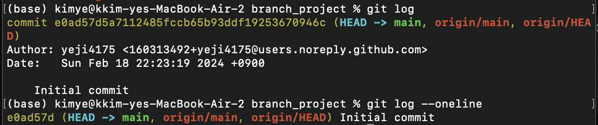 인 것을 확인할 수 있다. 이 의미는 해당 commit이 main branch가 가르키고 있는 버전이고 HEAD가 여기에 위치한다는 것은 현재 작업 중인 branch가 main branch이며, 해당 commit에서 작업을 진행 중이라는 의미이다.