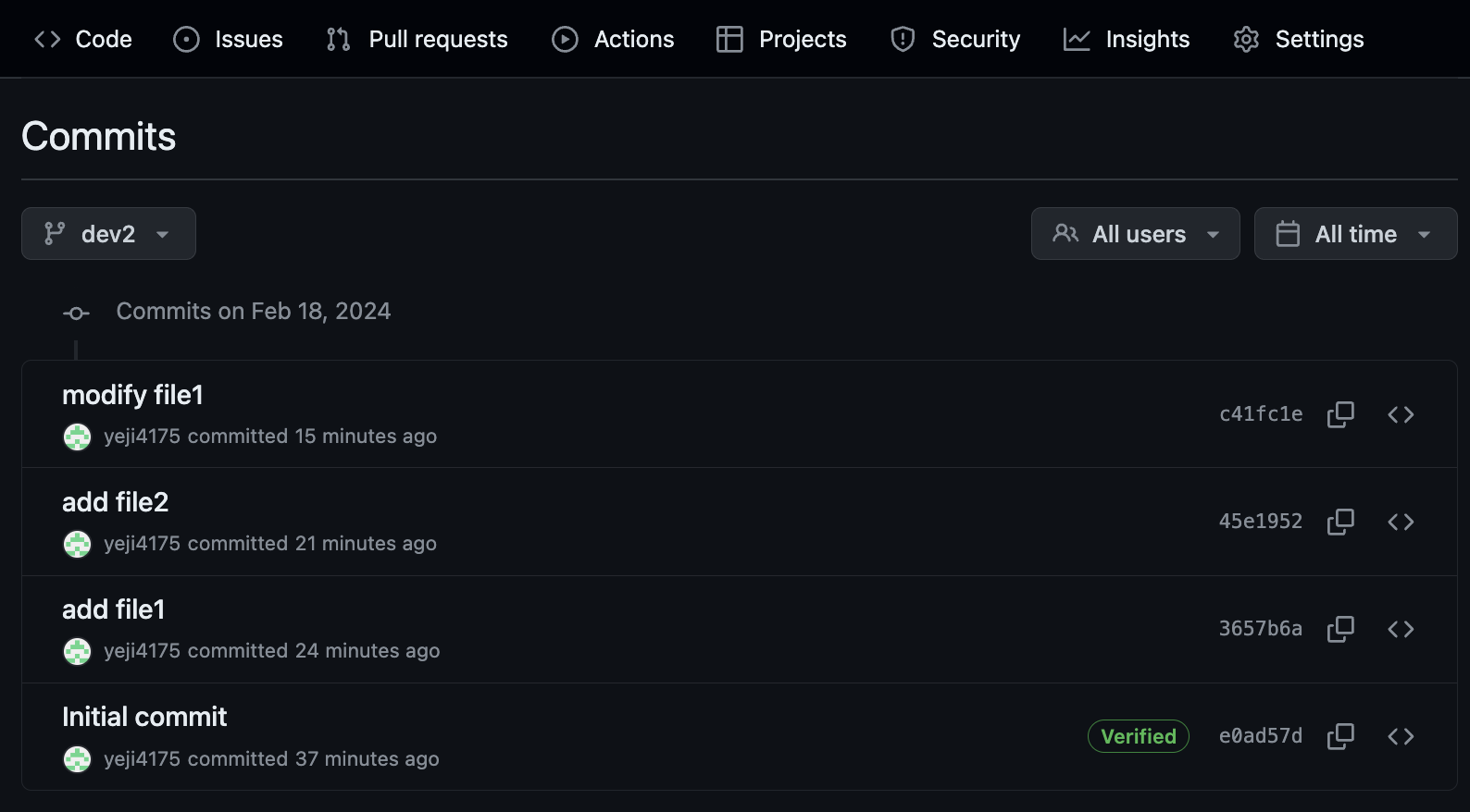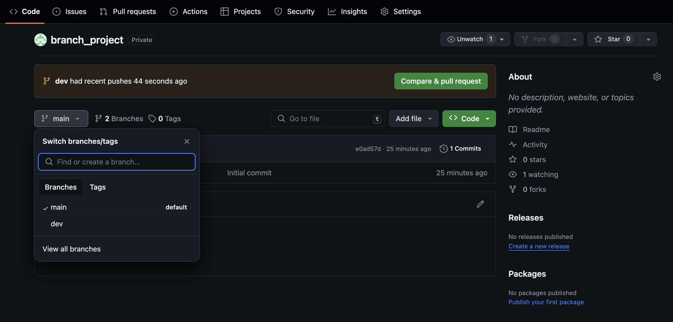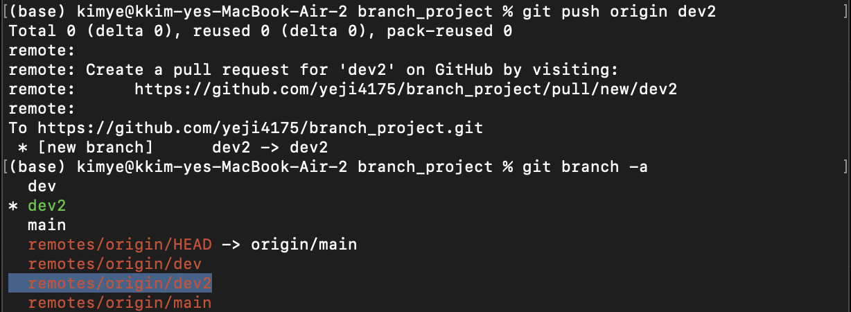 GitHub를 새로고침하면 remote에도 dev2 branch가 잘 배포되어 있는걸 확인할 수 있다.