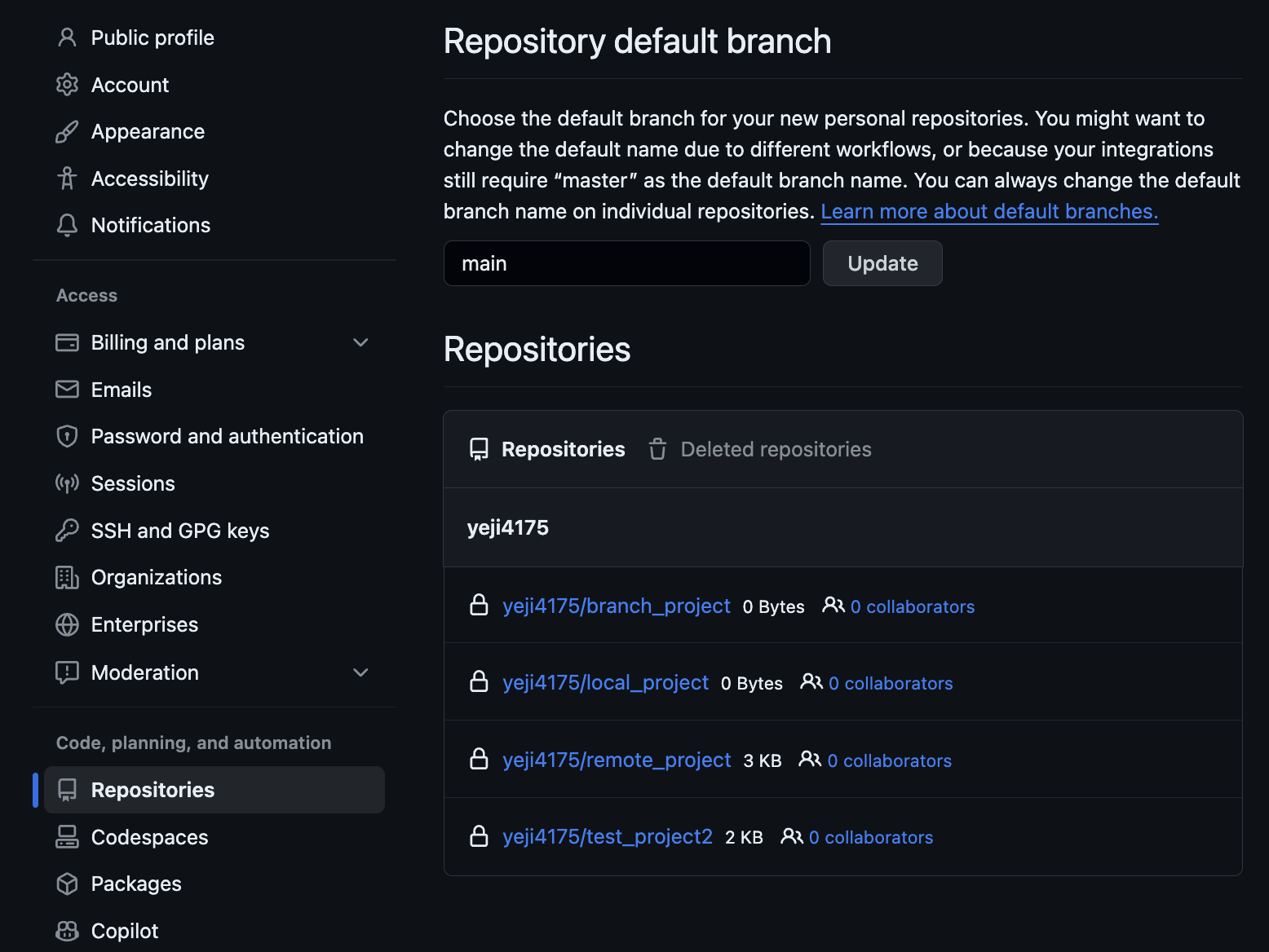 여기서 참고로 repository 기본 branch를 main에서 다른걸로 변경하고 싶으면 다음과 같은 프로세스를 따라하면 된다.