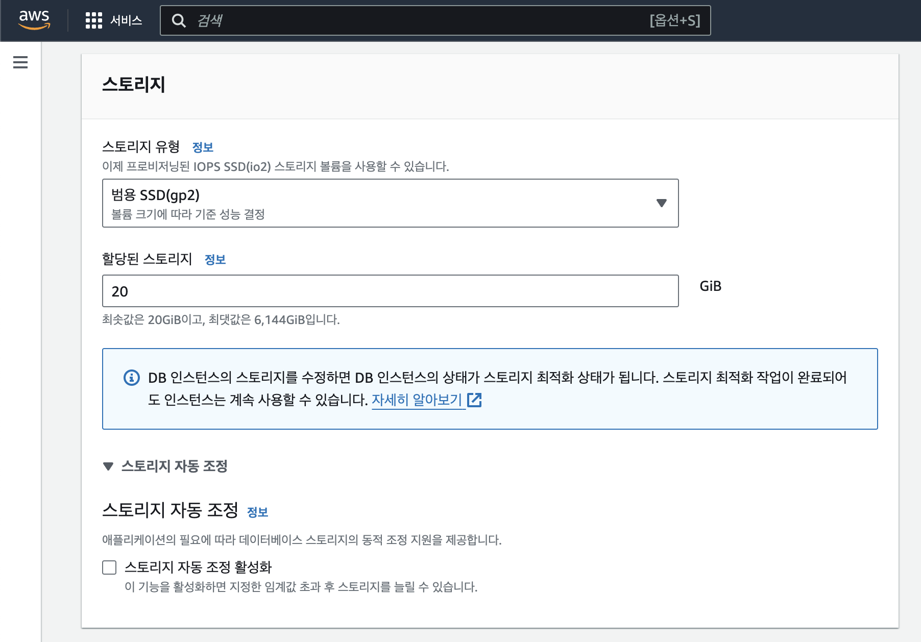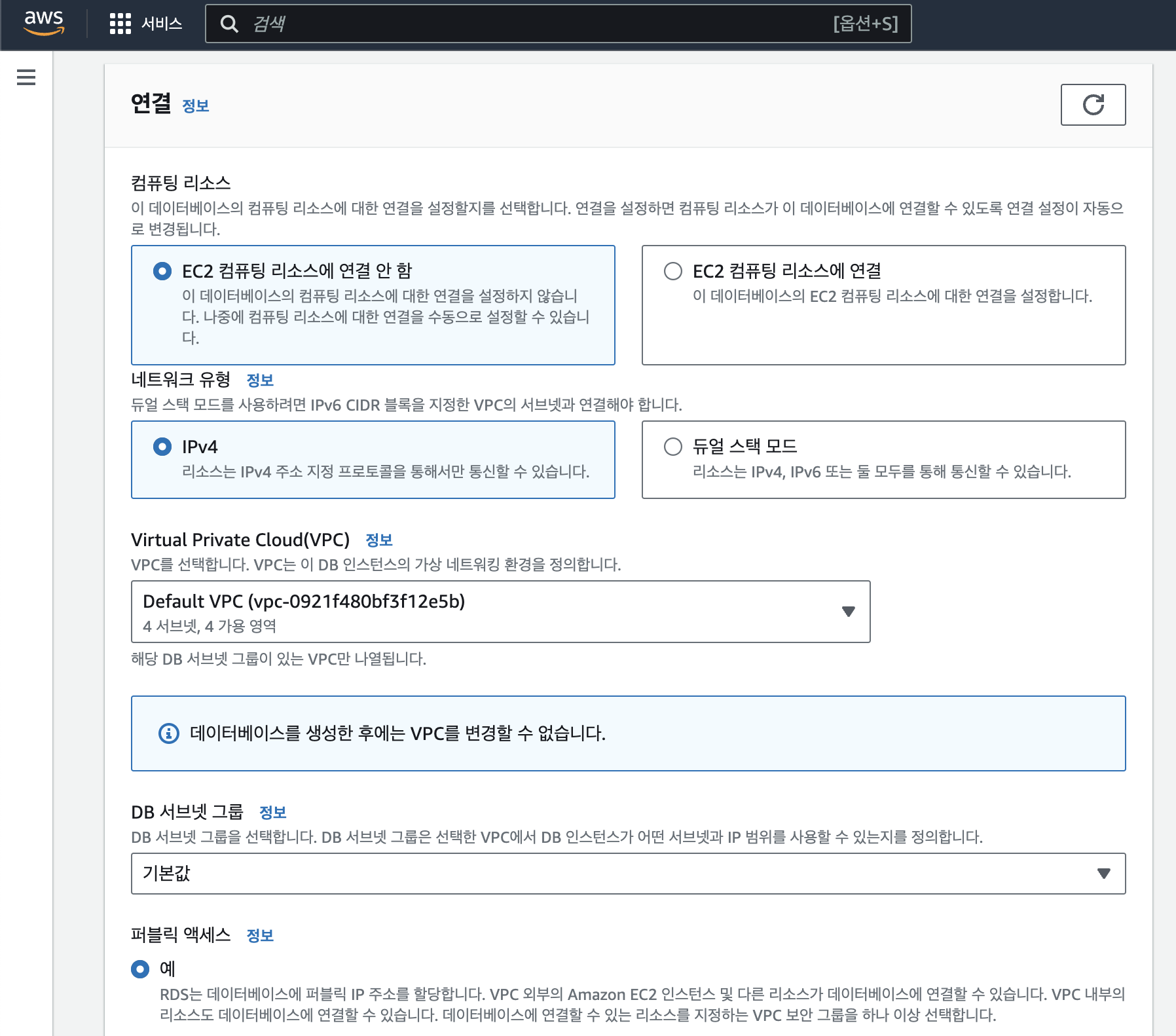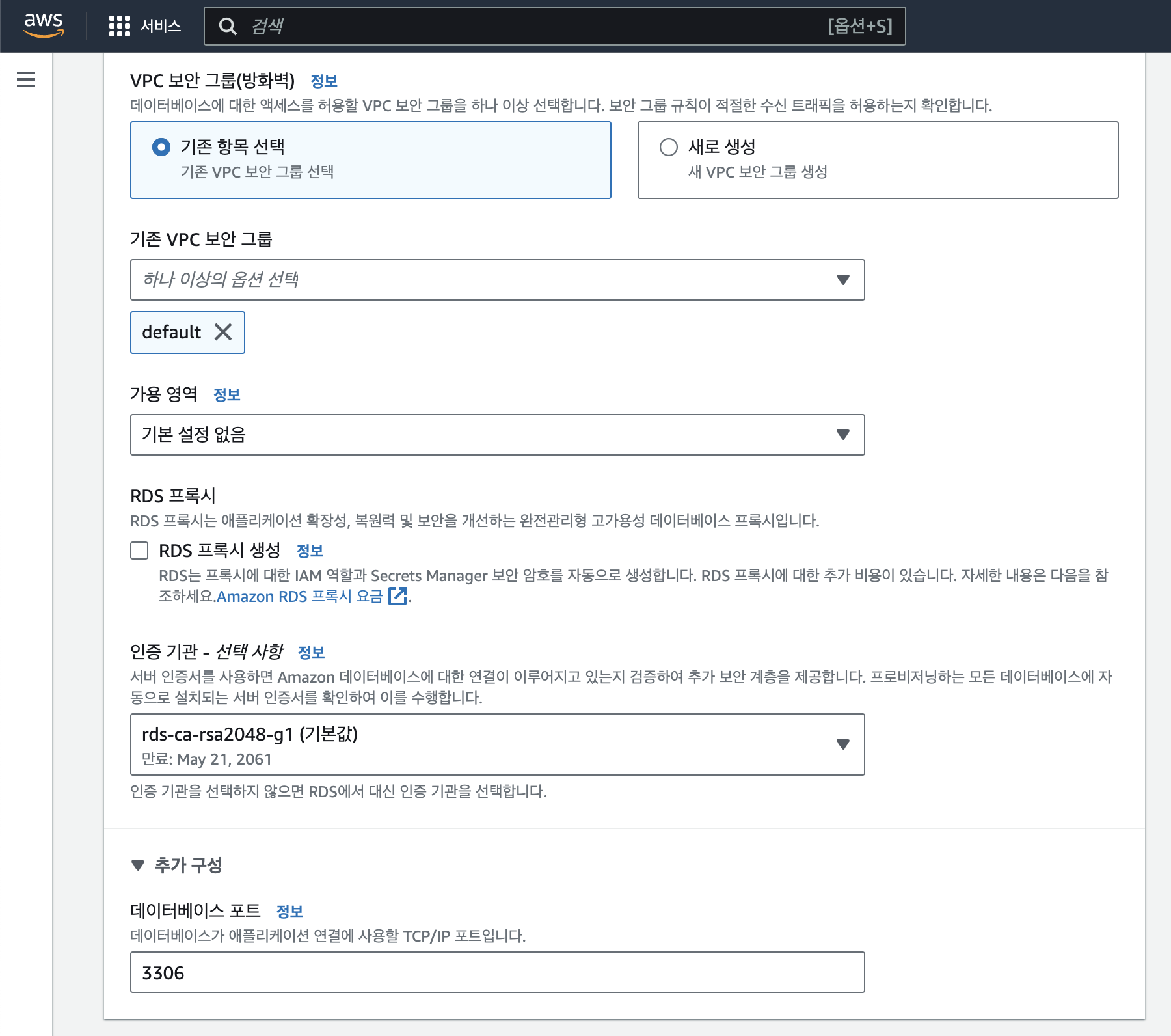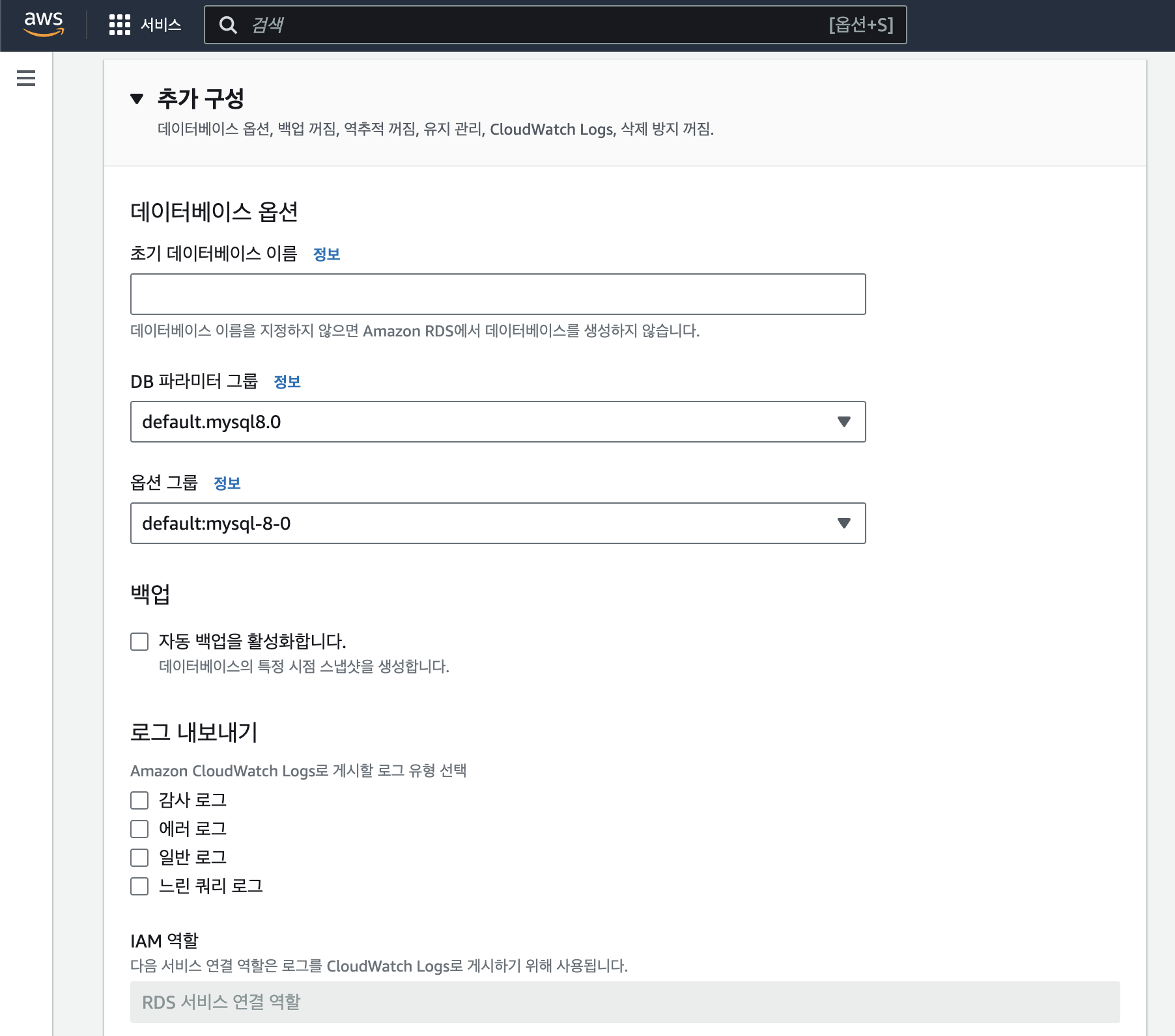 22) 초기 데이터베이스 생성하지 않고, 나머지 옵션(DB 파라미터 그룹, 옵션 그룹)을 기본값