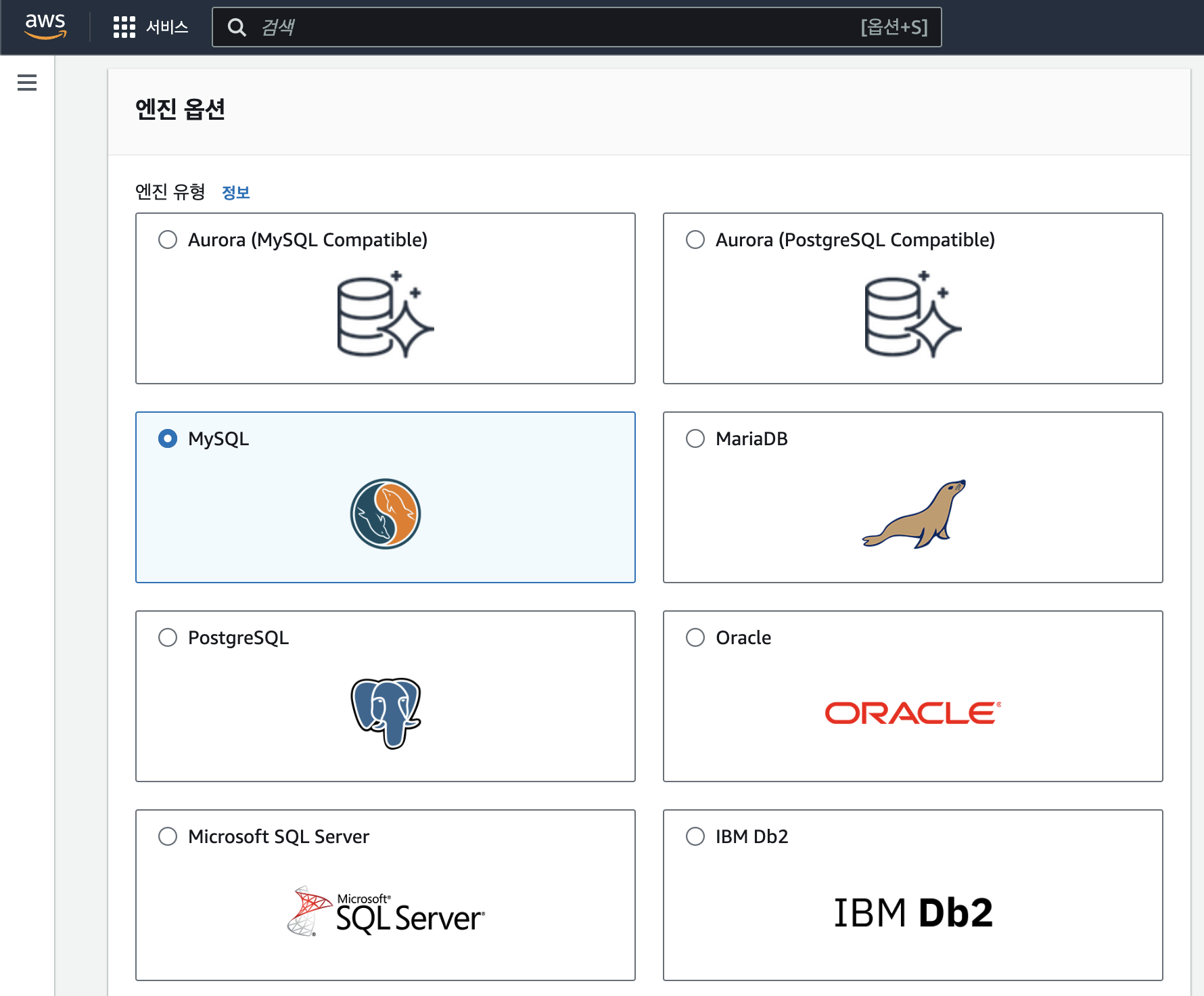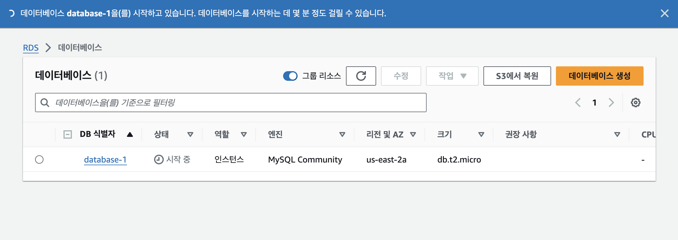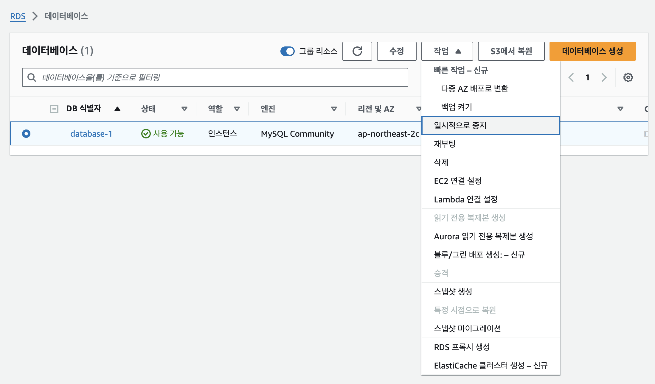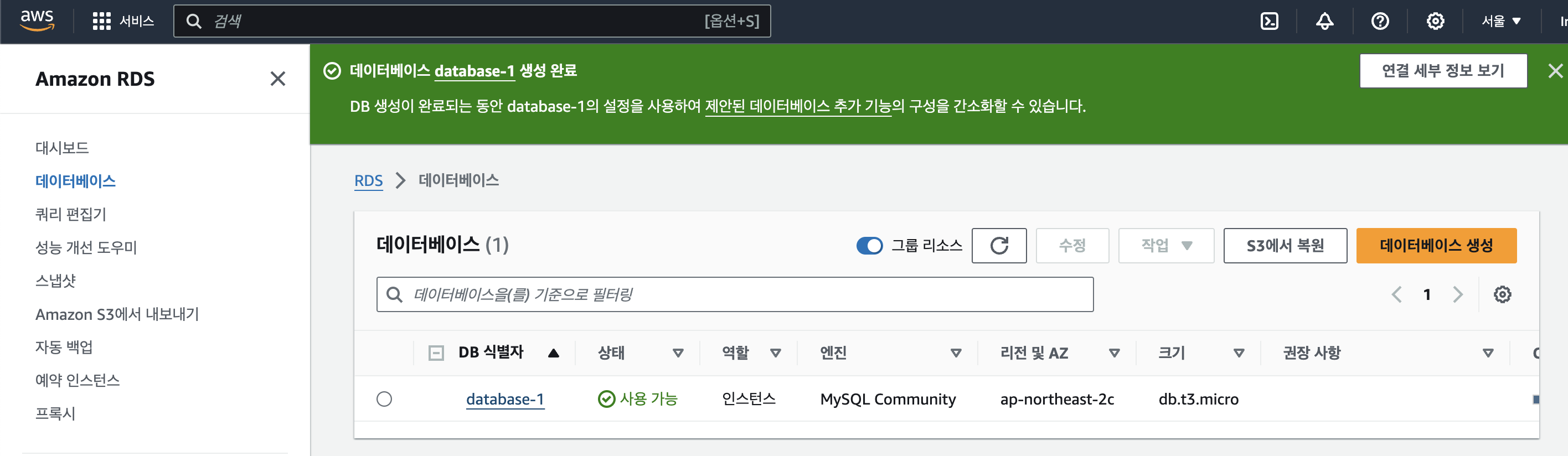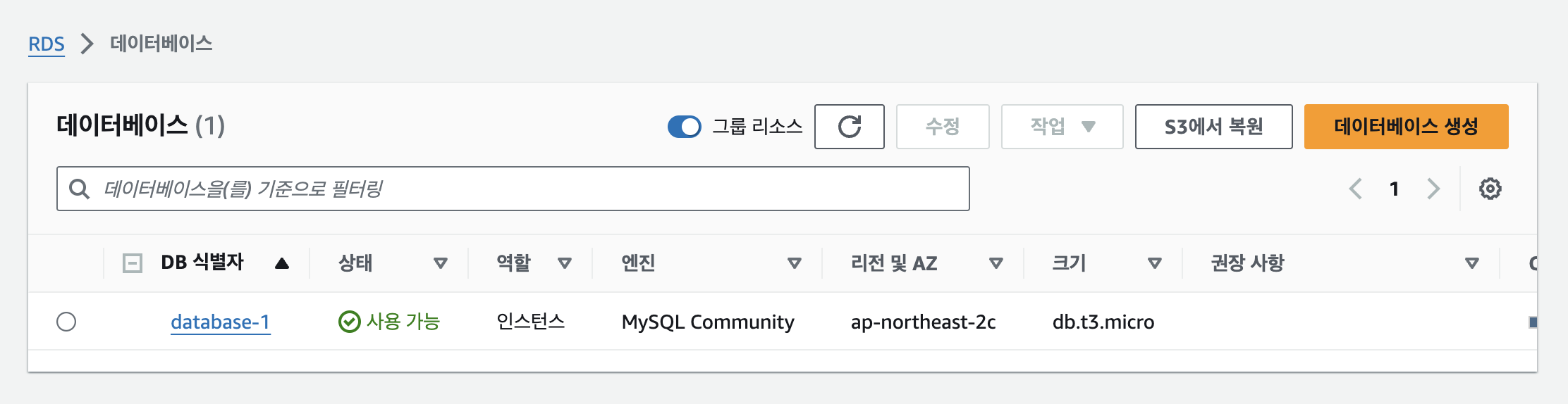 1) AWS 관리 콘솔 홈 > 서비스 > RDS > 데이터베이스