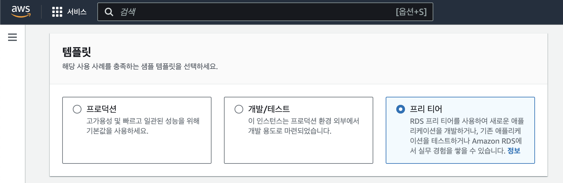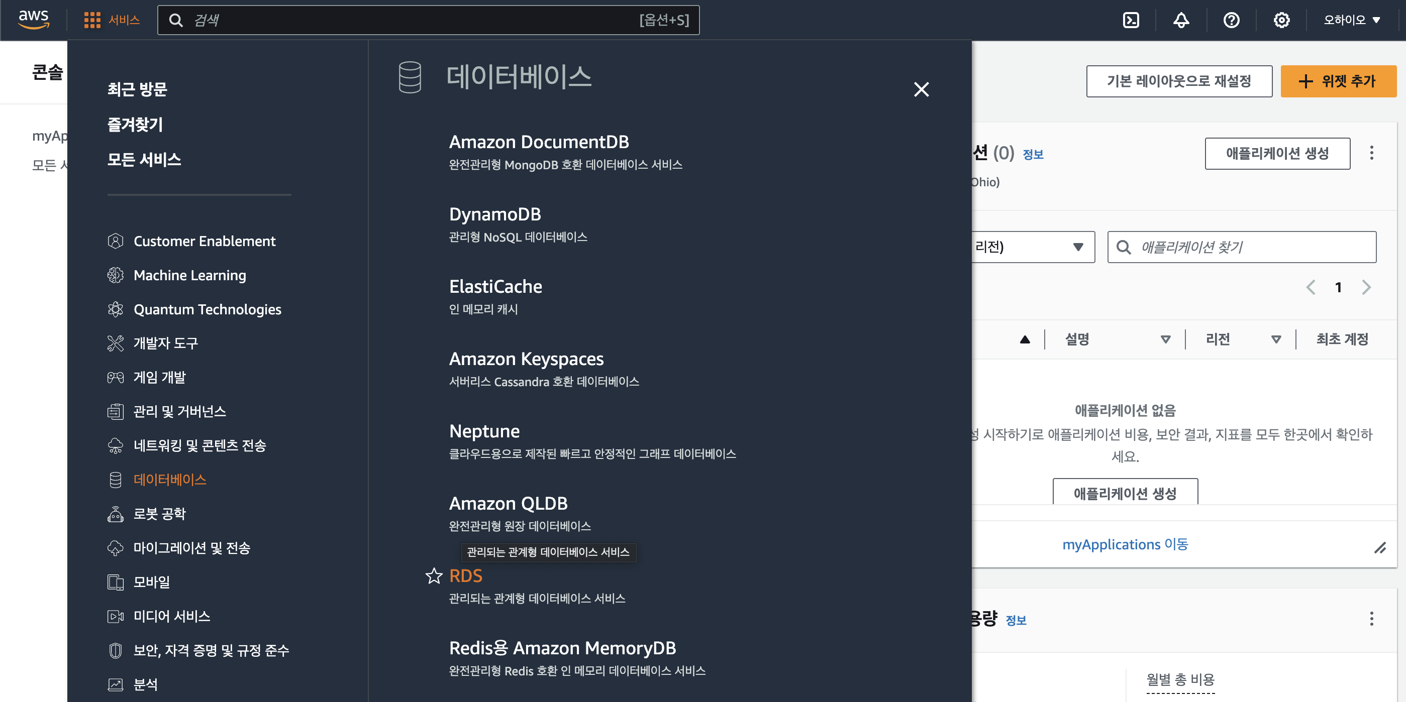 4) AWS 관리 콘솔 홈 > (왼쪽 상단) 서비스 > 데이터베이스 > RDS 클릭
