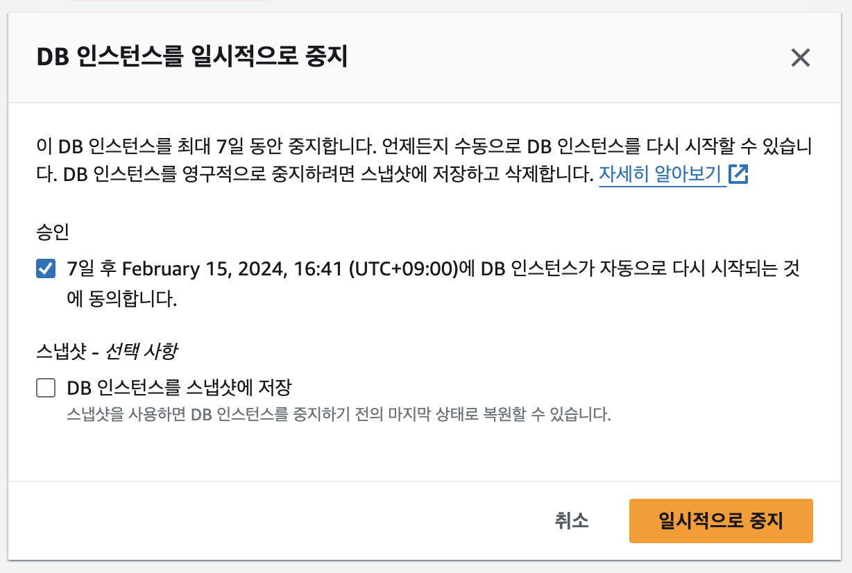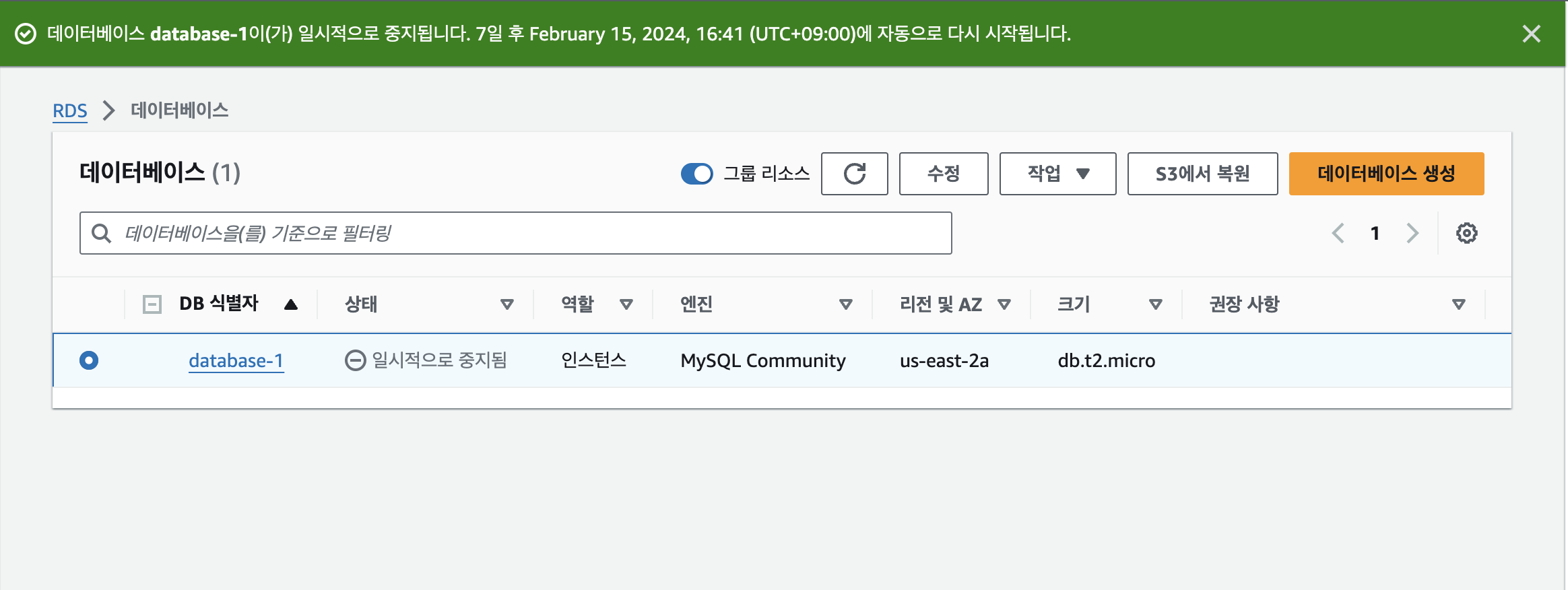 중지된 AWS RDS를 다시 시작하는 방법은 아래와 같다.
