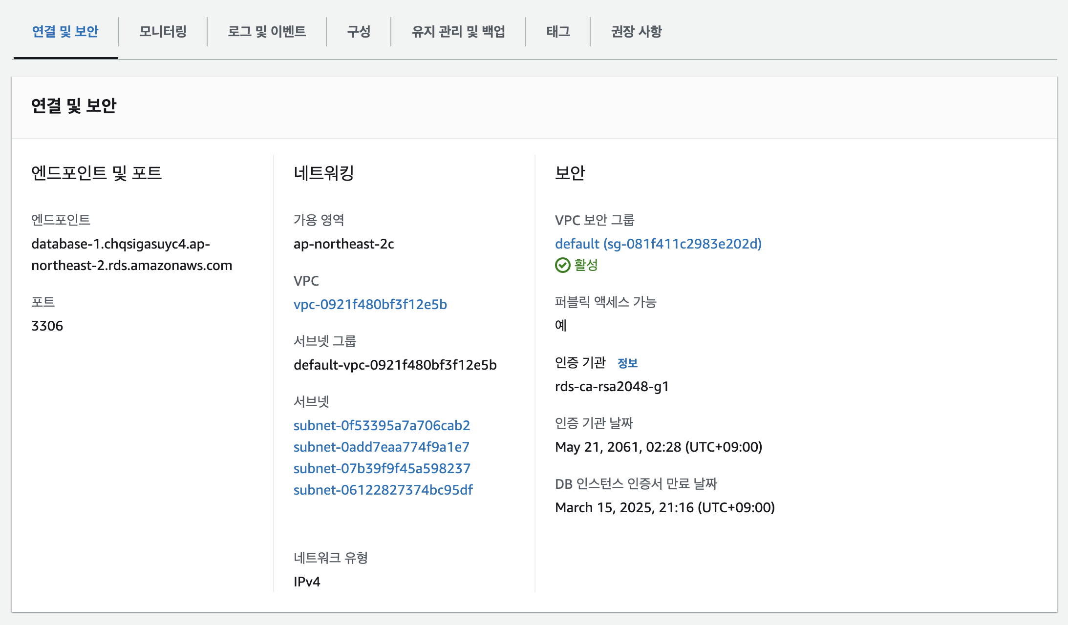 3) 선택된 데이터베이스 페이지에서 요약 정보 아래 연결&보안 탭에서 보안 항목의 VPC 보안 그룹 아래 default