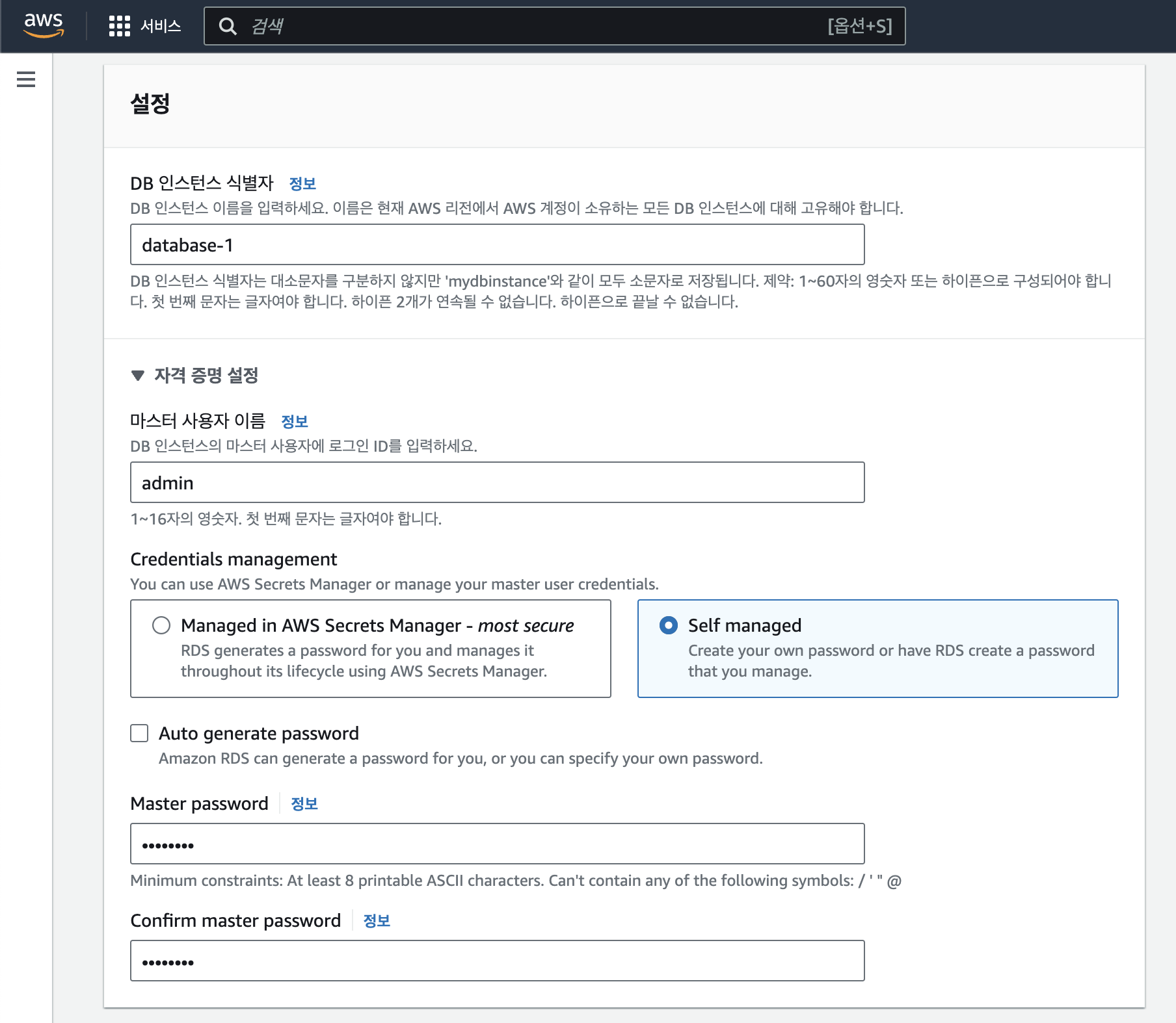 11) DB 인스턴스 식별자 및 마스터 사용자 이름은 기본값