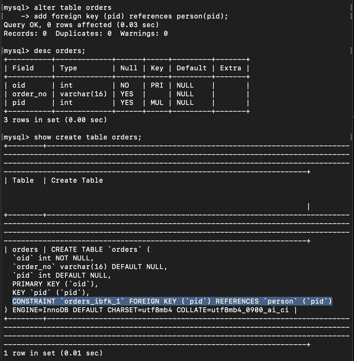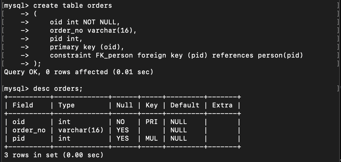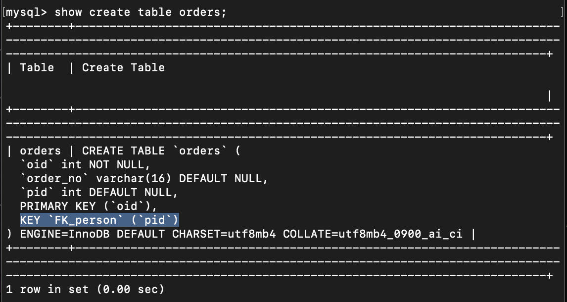 자동으로 constraint 'orders_ibfk_1' 생성된 걸 확인할 수 있으며 reference로 person 테이블에서 pid를 가져왔다고 알 수 있다.