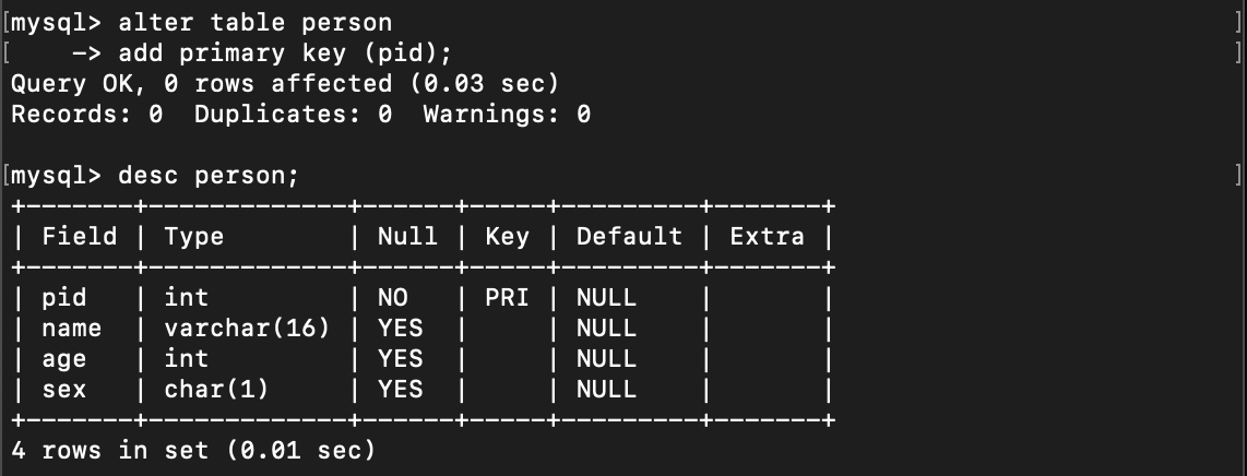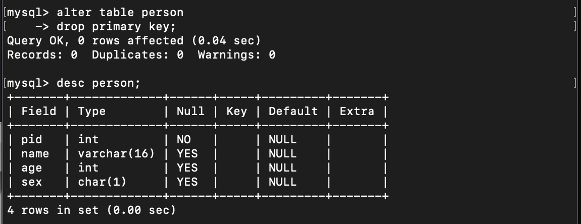 pid(person ID)의 key 속성에 primary key가 사라진걸 확인할 수 있다.