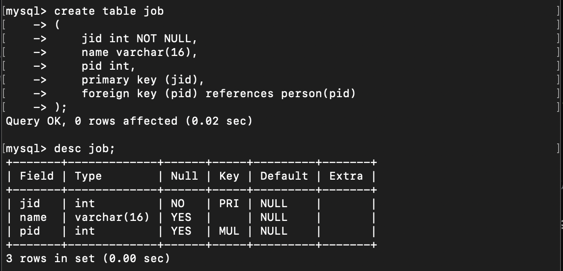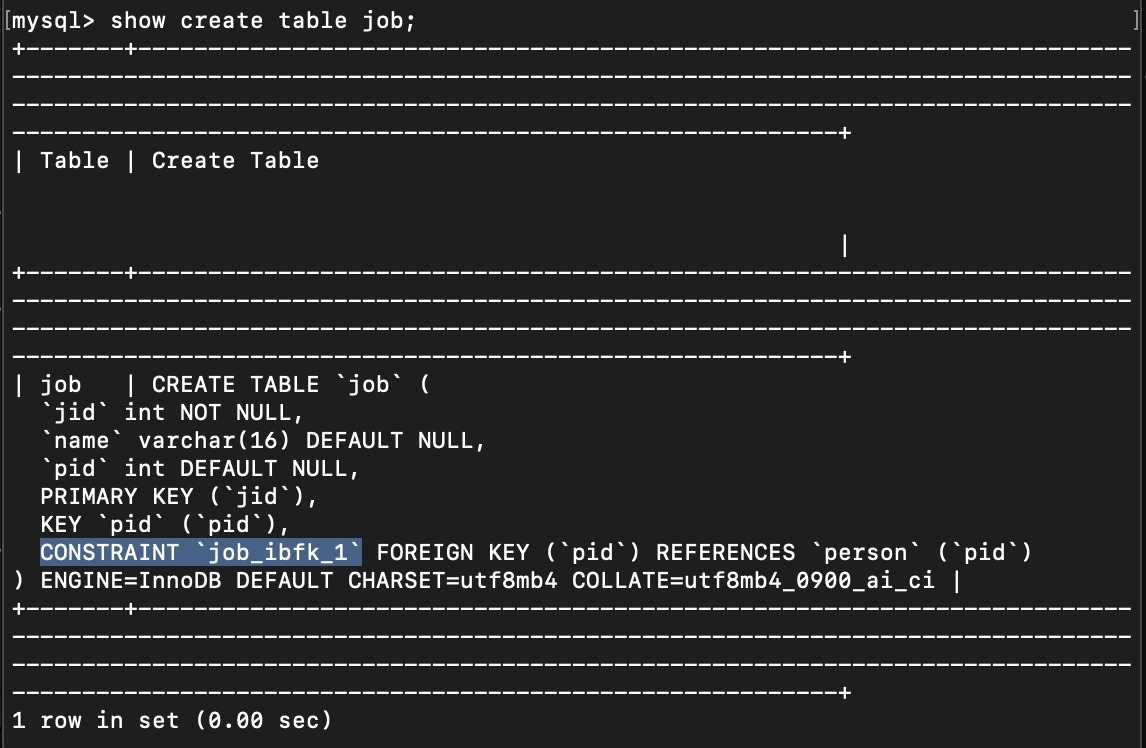 CONSTRAINT 'job_ibfk_1'로 생성되어 있는걸 확인할 수 있다. 해당 constraint 정보는 나중에 foreign key를 설정할 때 필요하다.