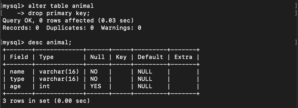 name과 type의 key 속성에 primary key가 사라진걸 확인할 수 있다.