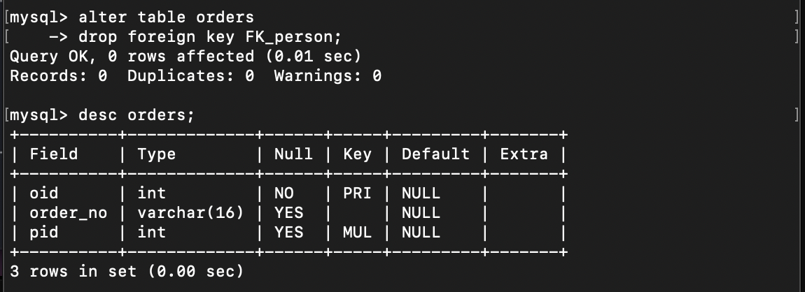Key 'FK_person' 은 남아있되 reference는 깨져있는걸 확인할 수 있다. 따라서, foreign key가 삭제되었다는 것을 알 수 있다.