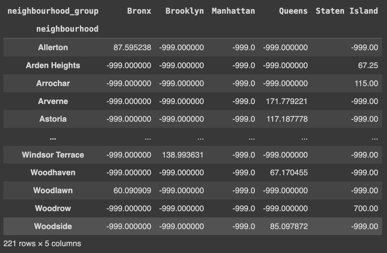 Ans = df.groupby(['neighbourhood','neighbourhood_group']).price.mean().unstack().fillna(-999)