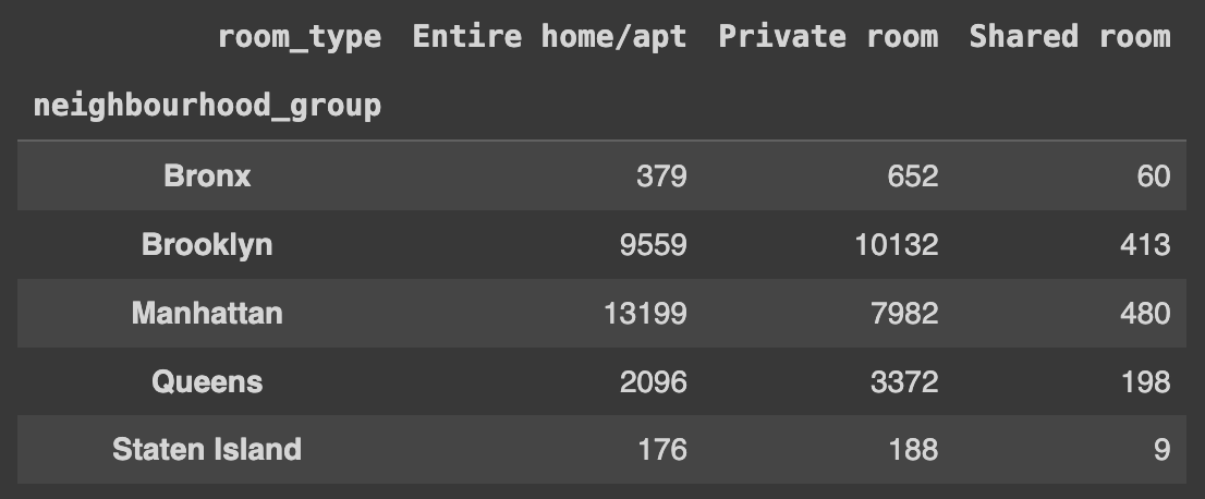 1) 'neighbourhood_group'과 'room_type'을 기준으로 데이터를 그룹화하고, 각 그룹 내의 빈도를 계산한 후 unstack()