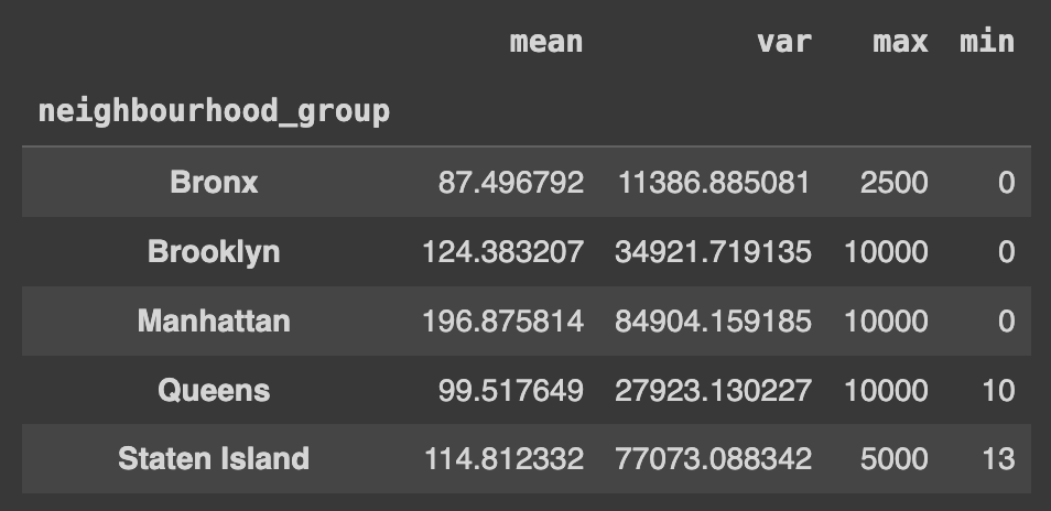 Ans = df.groupby('neighbourhood_group')['price'].agg(['mean','var','max','min'])