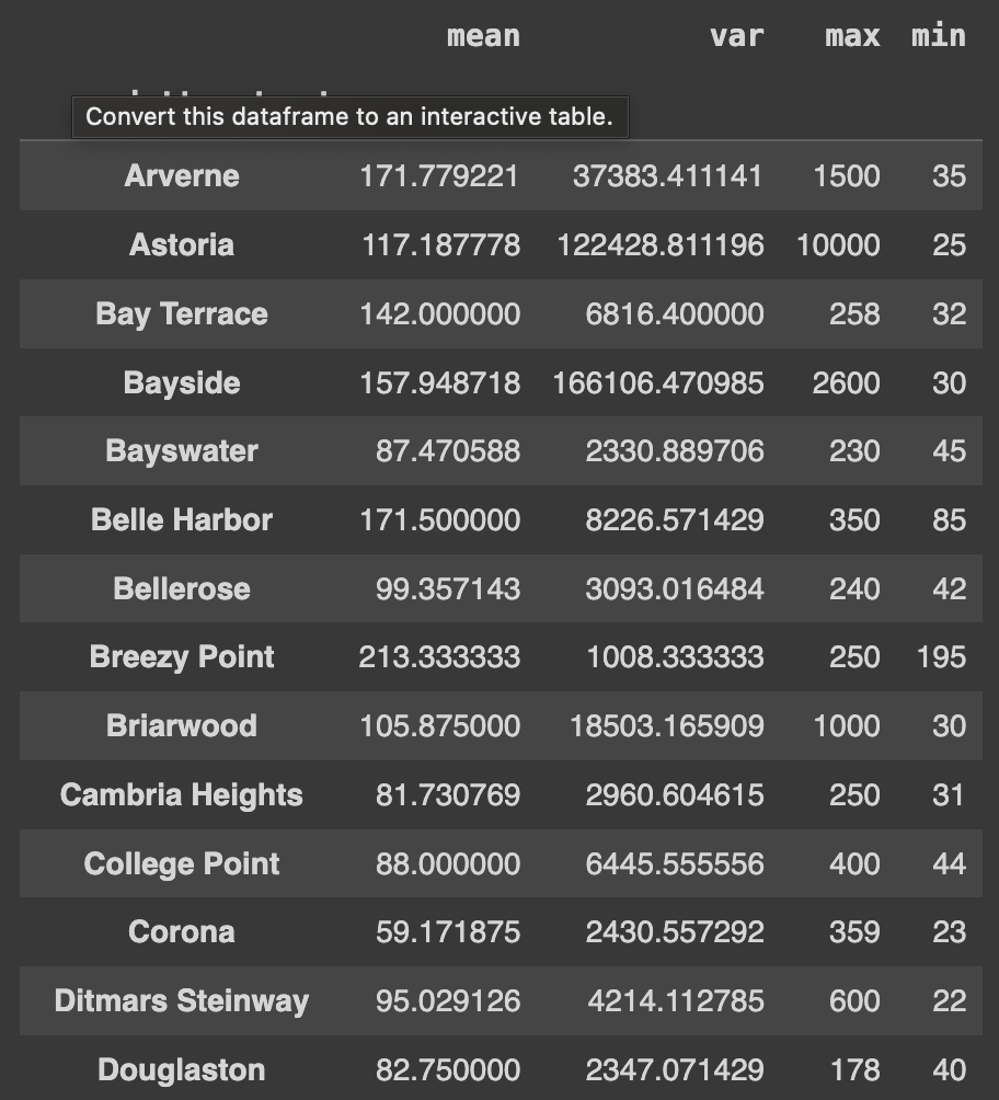 # Queens 지역에서 각 neighbourhood의 가격에 대한 평균, 분산, 최대값, 최소값 계산
