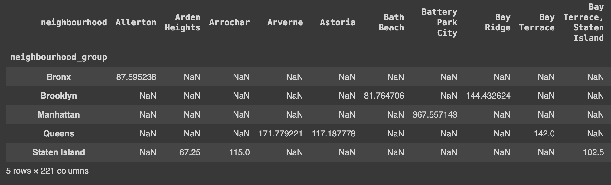 Ans = df.groupby(['neighbourhood_group', 'neighbourhood']).price.mean().unstack()