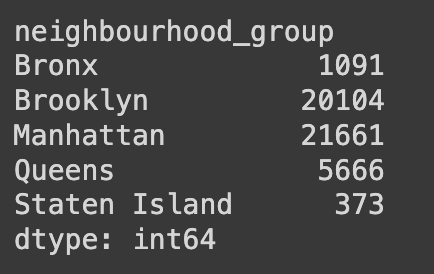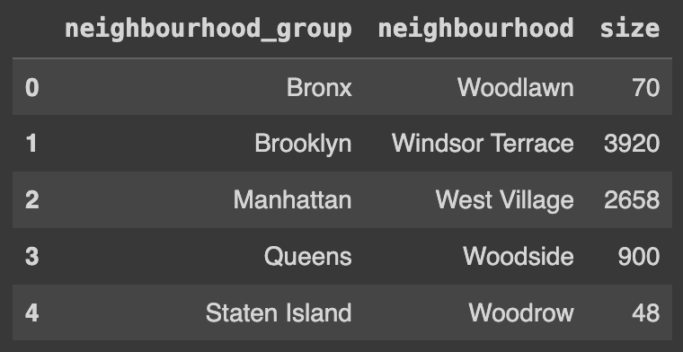 # 'neighbourhood_group'과 'neighbourhood' 열을 기준으로 그룹화하고, 각 그룹의 크기를 계산. 그런 다음 'neighbourhood_group'을 기준으로 다시 그룹화하고, 각 그룹에서 최대값 계산