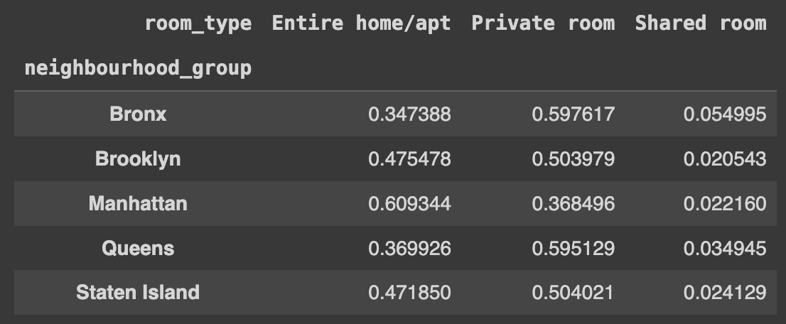 # neighbourhood_group 및 room_type에 따른 각 조합의 빈도를 계산하고, 그 값을 해당 행의 합계로 나누어서 각 그룹 내의 비율 계산