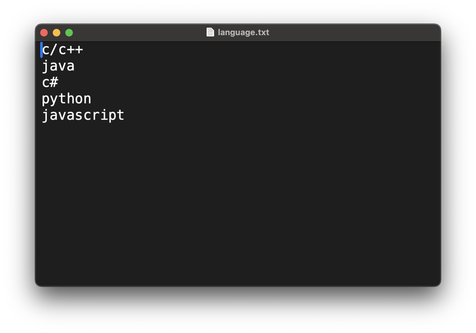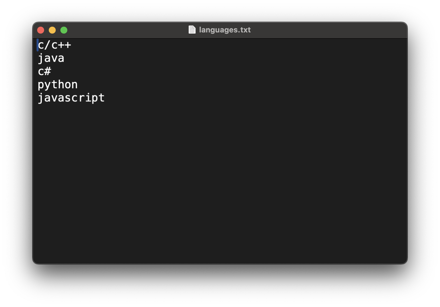 languages = ['c/c++', 'java', 'c#', 'python', 'javascript']