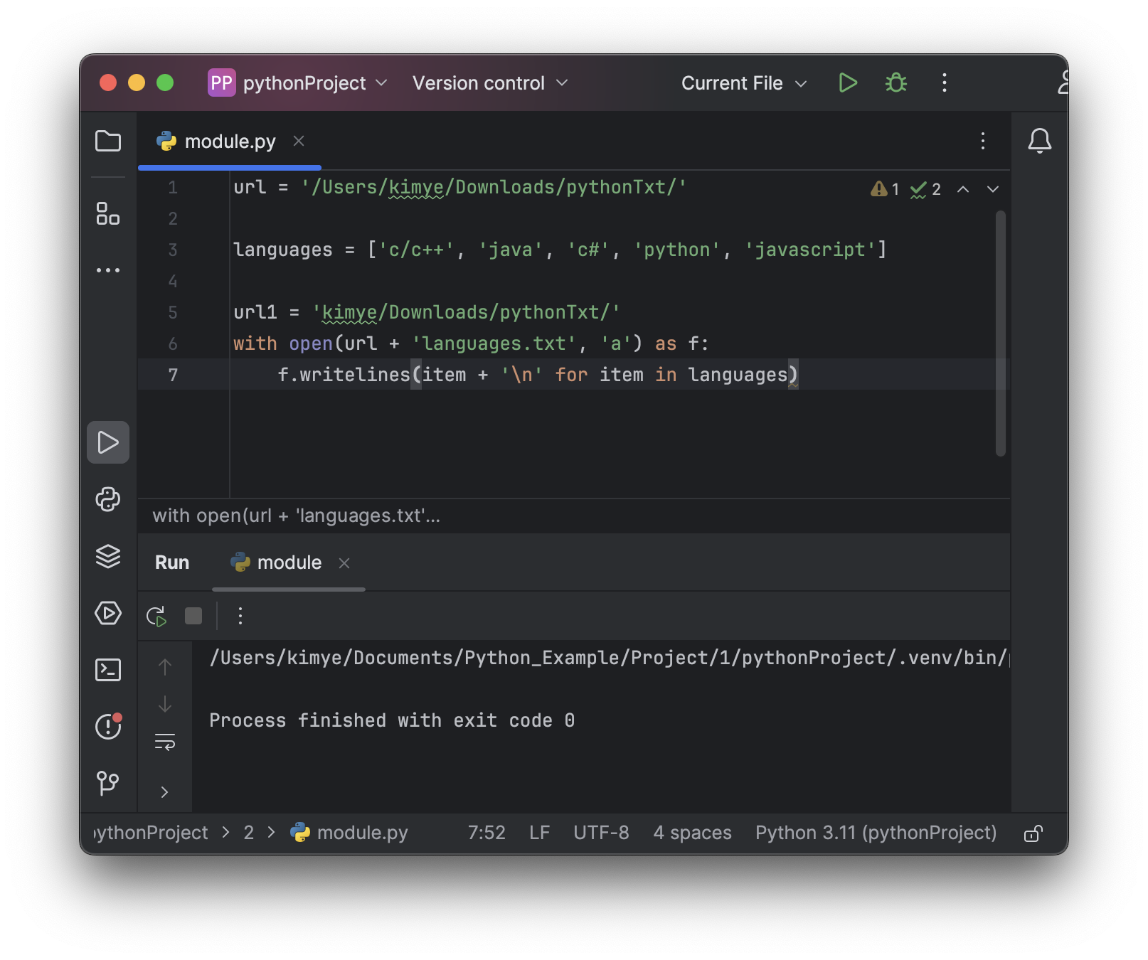 위의 코드는 'example.txt'라는 파일을 열고, writelines() 함수를 사용하여 lines 리스트의 요소들을 파일에 작성한다.