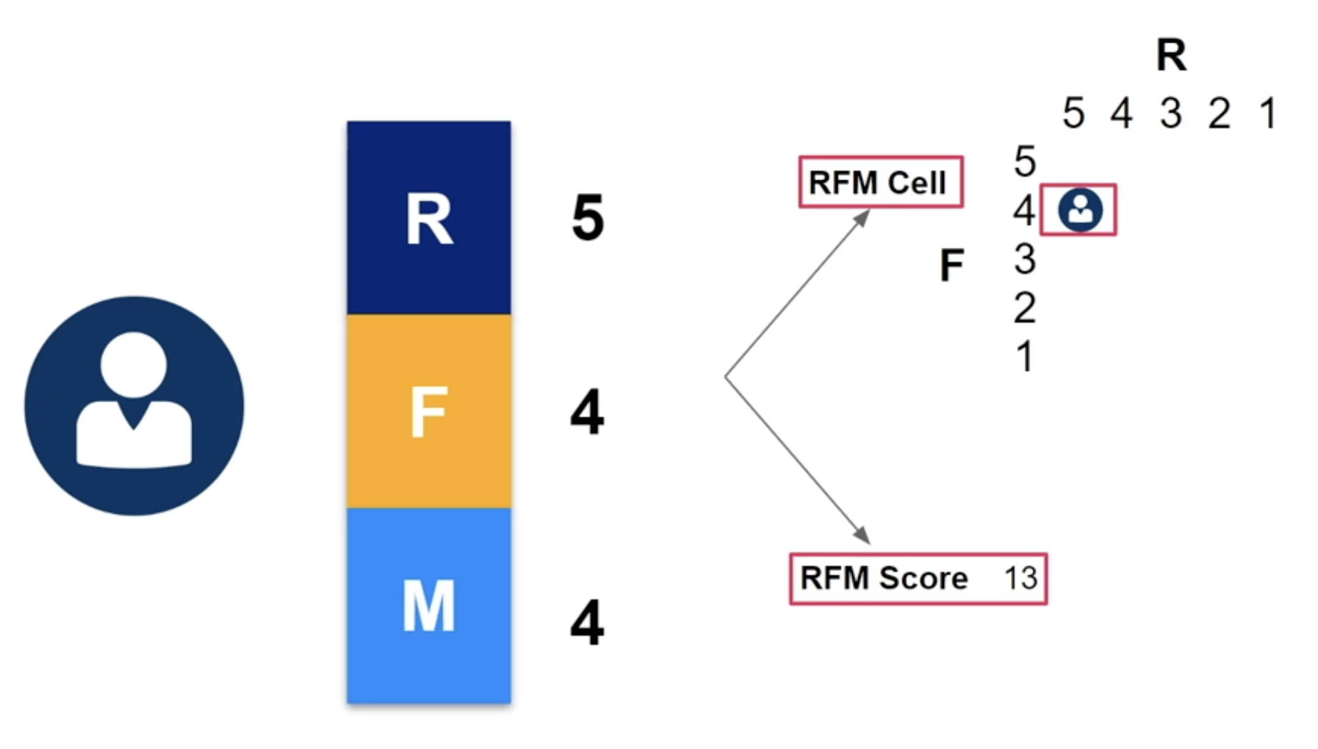 각 요소별로 구한 등급을 활용해 표를 만들어 고객이 속한 RFM Cell을 부여할 수 있다. 또는 각 요소 등급을 단순히 더하거나 등급에 따른 계산법을 사용해 스코어를 만들어 고객을 구분할 수도 있다.