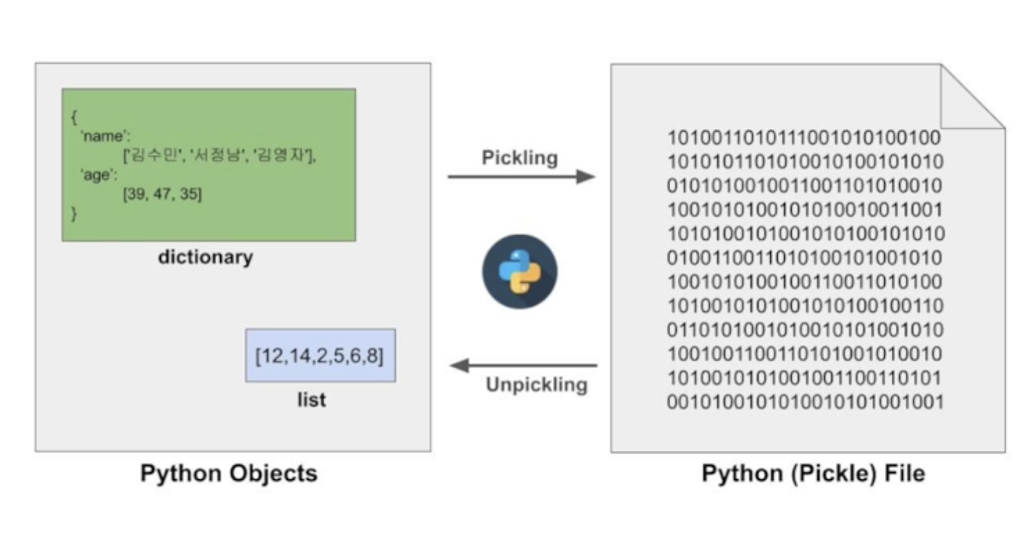 pickle은 기본적인 라이브러리로 객체를 직렬화하고 역직렬화하는 기능을 제공한다.