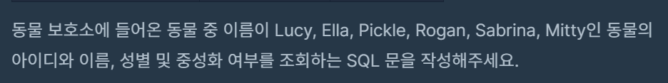 - 조건 : 이름이 lucy, ella, pickle, rogan, sabrina, mitty인 동물