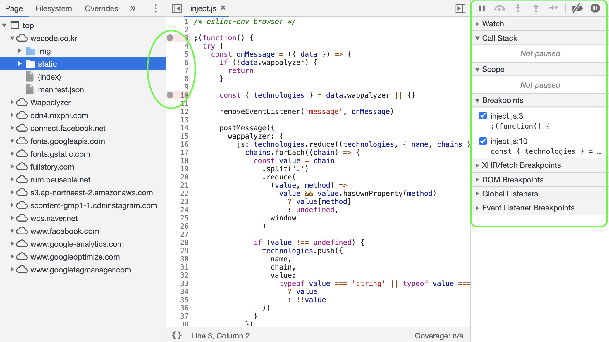 -연두색 부분,소스코드 줄을 누르면 breakpoint가 생기고 그 부분이 실행되면 코드 실행이 중지 된다.)