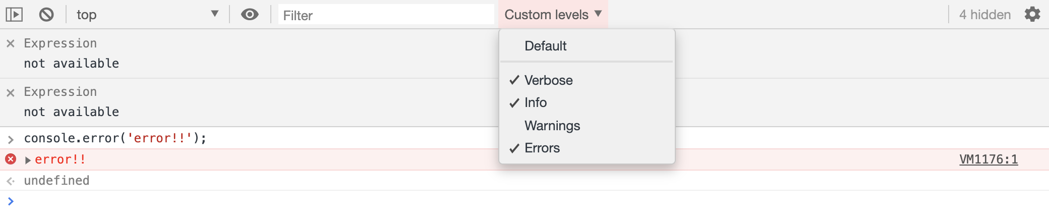 console.log()console.warn() : 경고 메시지 출력 / 노란색 세모 느낌표 표시console.error() : 에러메시지 출력 / 빨간 동그라미 X 표시참고로 console.log()를 자주 사용합니다.