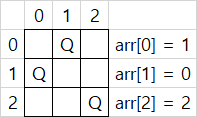 퀸은 한 행에 하나씩만 놓을 수 있으므로, N*N의 체스판에 N개의 퀸을 배치하려면 모든 행에 하나의 퀸이 배치되어야 한다!