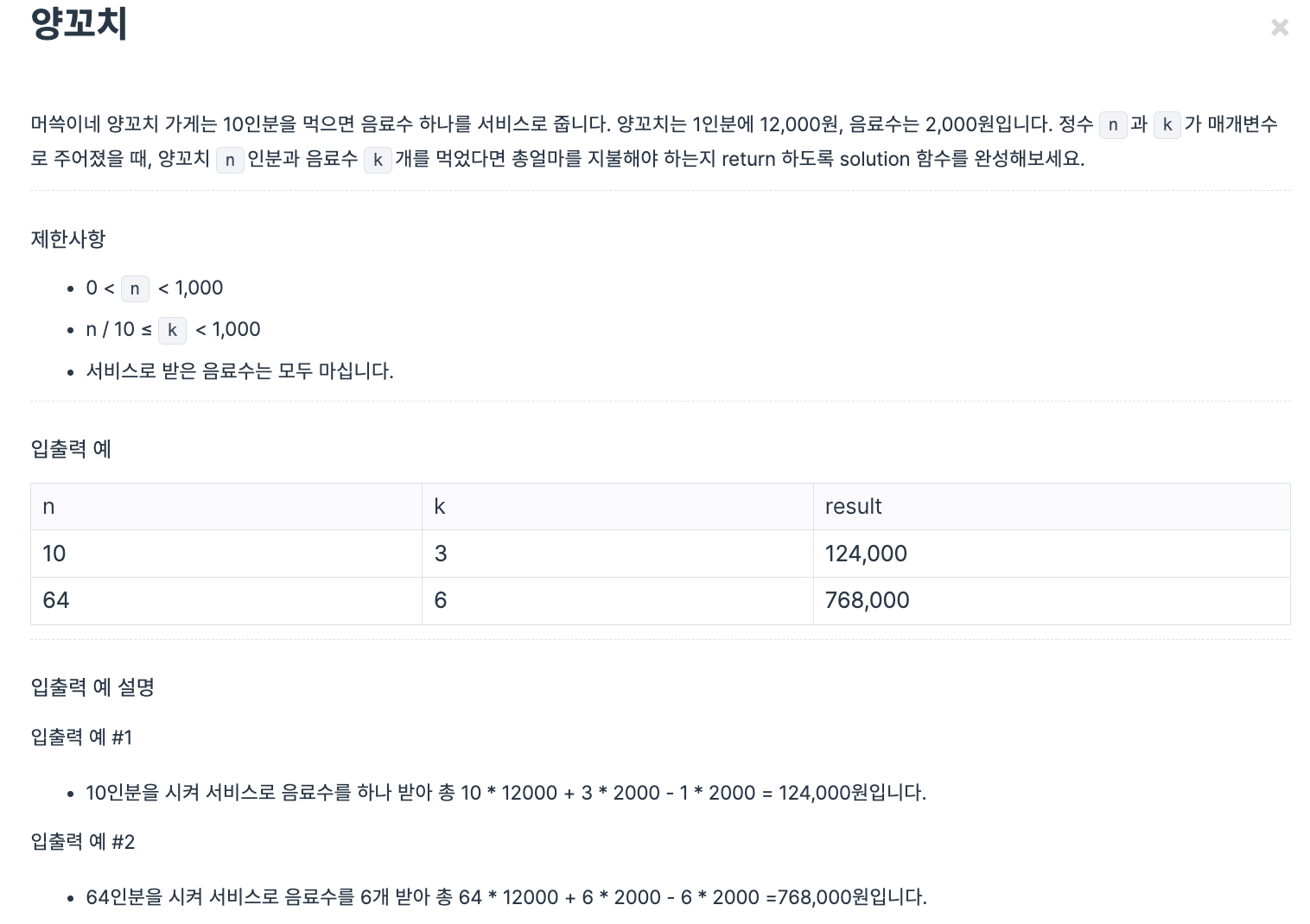 function solution(n, k) { k-=~~(n/10); if (k < 0) k = 0; return n*12000+k*2000; }사용된 메서드와 개념