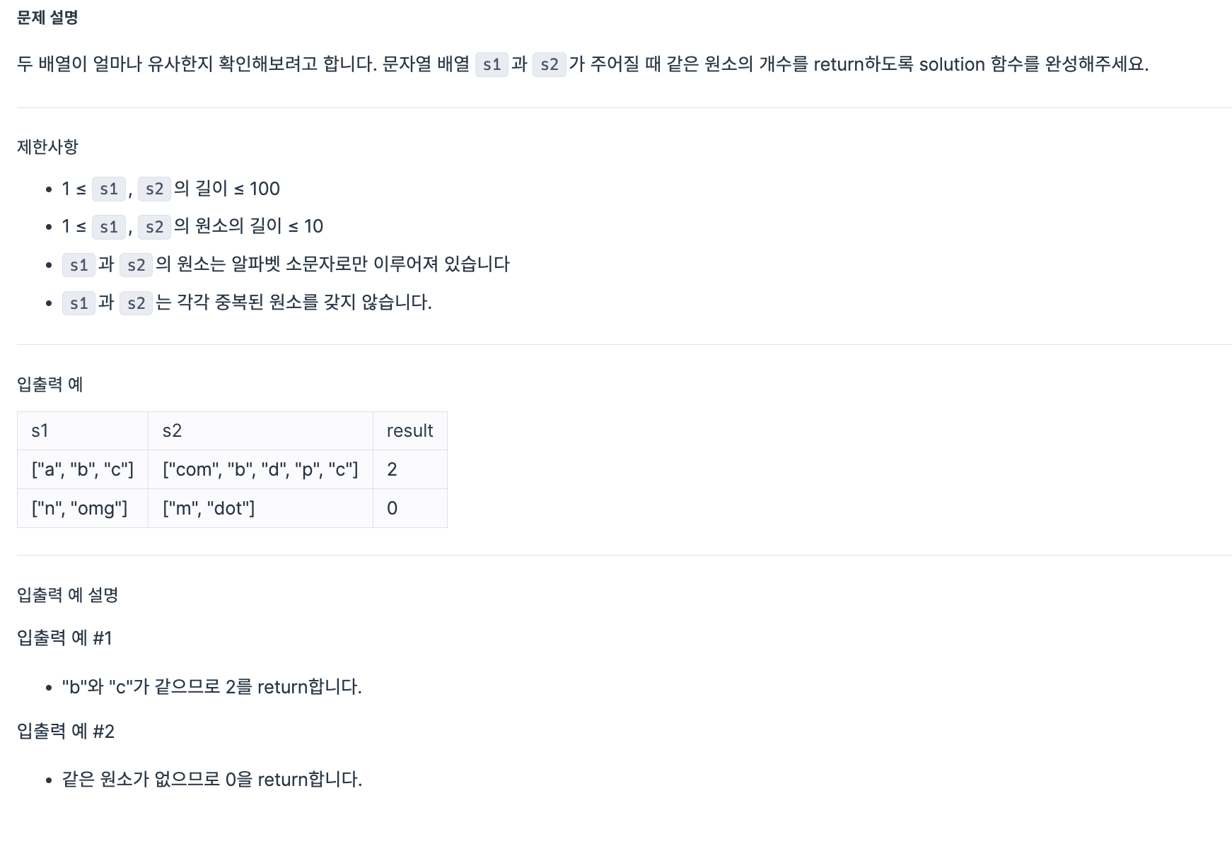 function solution(s1, s2) { const commonElements = s1.filter(element => s2.includes(element)); return commonElements.length; } console.log(solution(["a", "b", "c"], ["com", "b", "d", "p", "c"])); // 출력: 2참고 자료