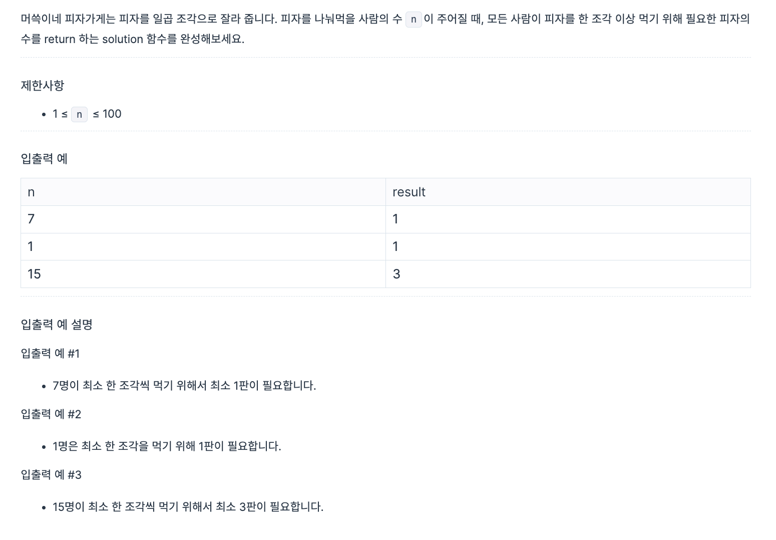 Mission. 작성한 답 function solution(n) { return Math.ceil(n/7); } 참고 자료 https://school.programmers.co.kr/learn/courses/30/lessons/120814