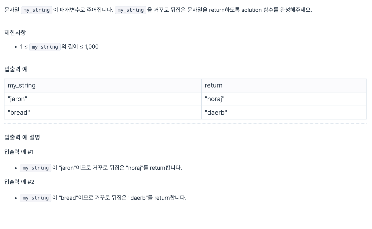 function solution(my_string) { var charArray = my_string.split(''); var reversedArray = charArray.reverse(); var reversedString = reversedArray.join(''); return reversedString; }참고 자료