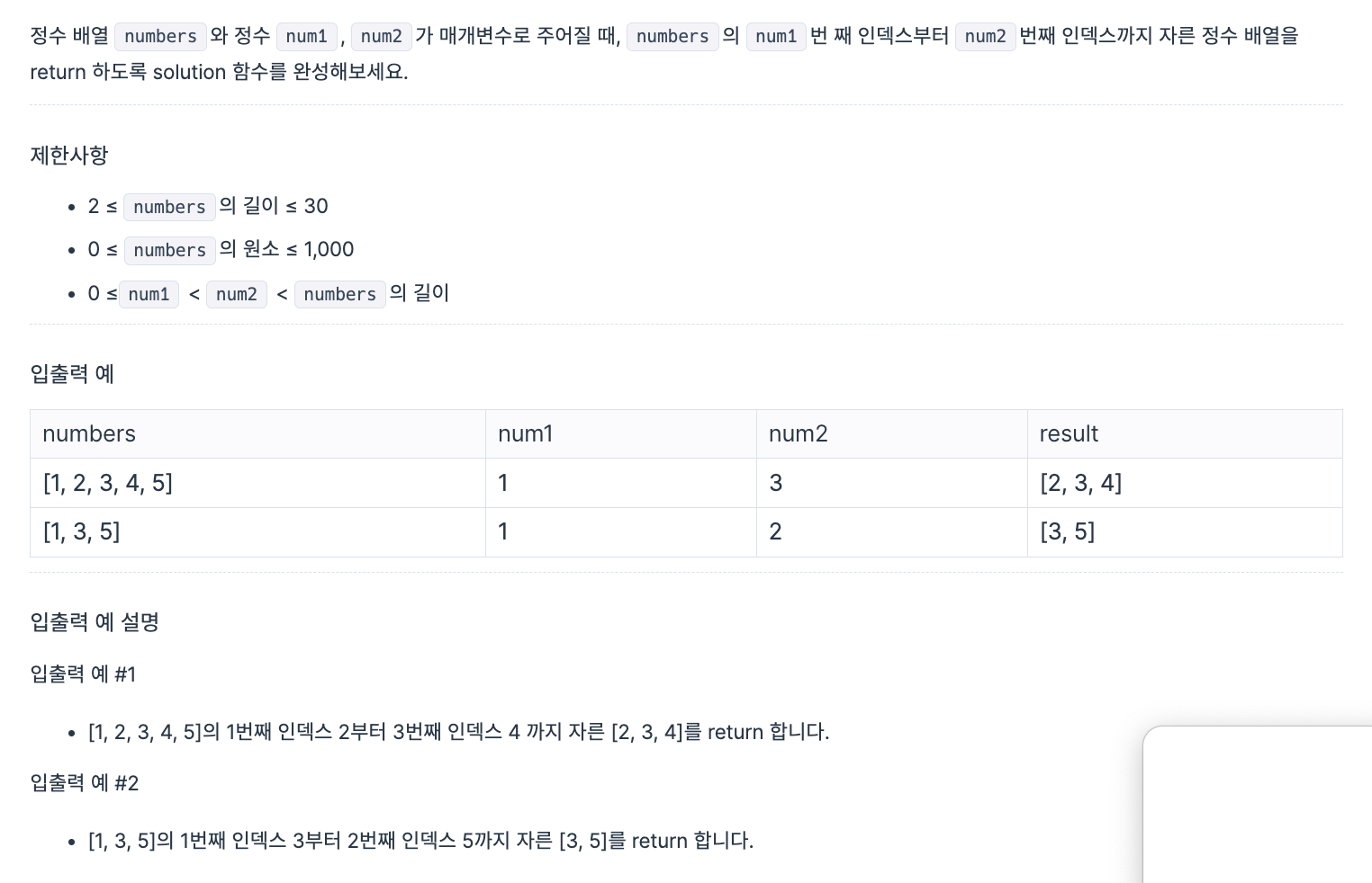 Mission. 작성한 답 function solution(numbers, num1, num2) { return numbers.slice(num1, num2 + 1); } 참고 자료 https://school.programmers.co.kr/learn/courses/30/lessons/120833