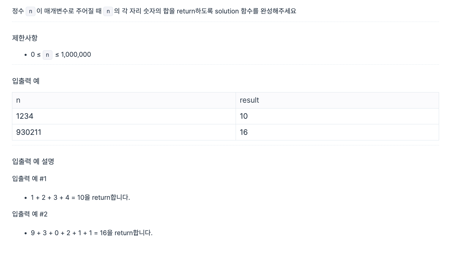 Mission. 작성한 답 function solution(n) { return String(n).split('').reduce((acc, curr) => acc + Number(curr), 0); } 참고 자료 https://school.programmers.co.kr/learn/courses/30/lessons/120906