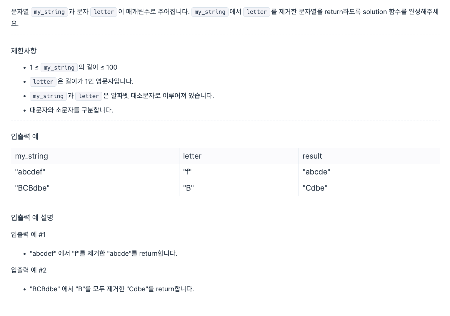 Mission. 작성한 답 function solution(my_string, letter) { let result = my_string.split(letter).join(''); return result; } 참고 자료 https://school.programmers.co.kr/learn/courses/30/lessons/120826