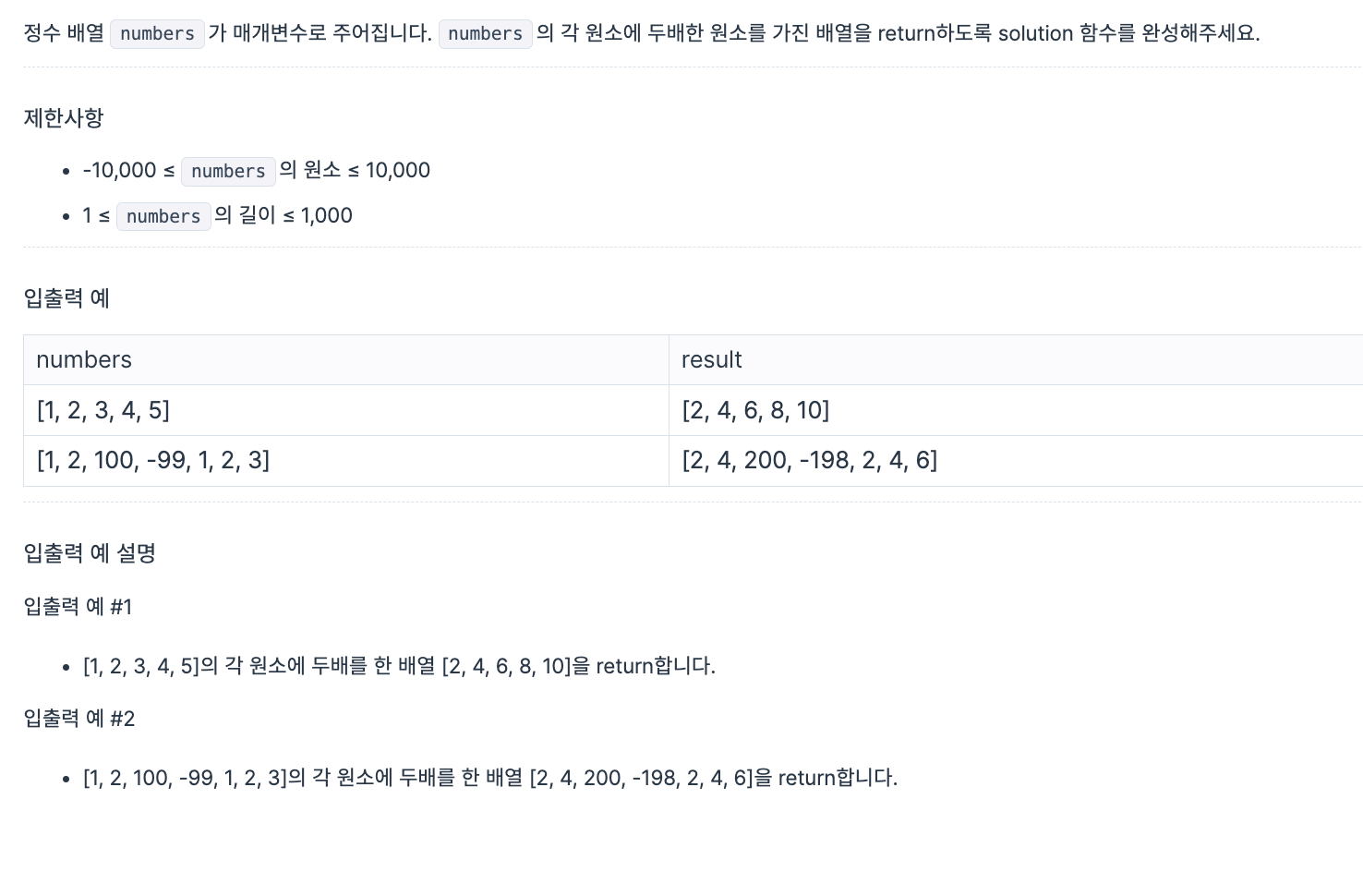 Mission. 작성한 답 function solution(numbers) { const doubledNumbers = []; for (let i = 0; i < numbers.length; i++) { doubledNumbers.push(numbers[i] * 2); } return doubledNumbers; } 참고 자료 https://school.programmers.co.kr/learn/courses/30/lessons/120809