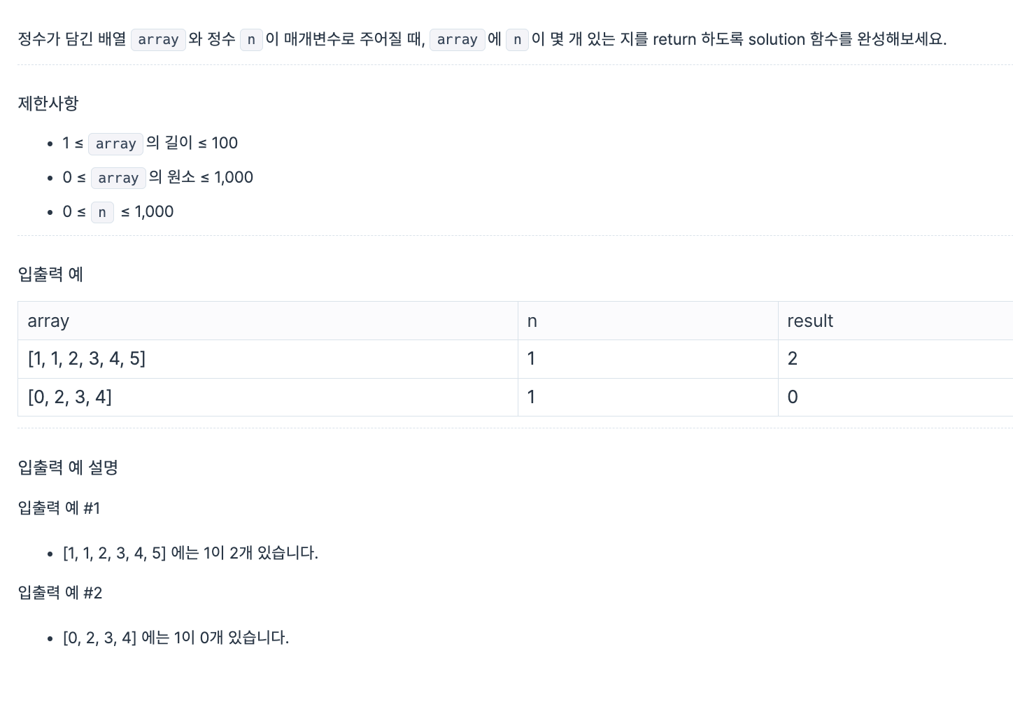 Mission. 작성한 답 function solution(array, n) { let count = 0; for (let i = 0; i < array.length; i++) { if (array[i] === n) { count++; } } return count; } 참고 자료 https://school.programmers.co.kr/learn/courses/30/lessons/120583