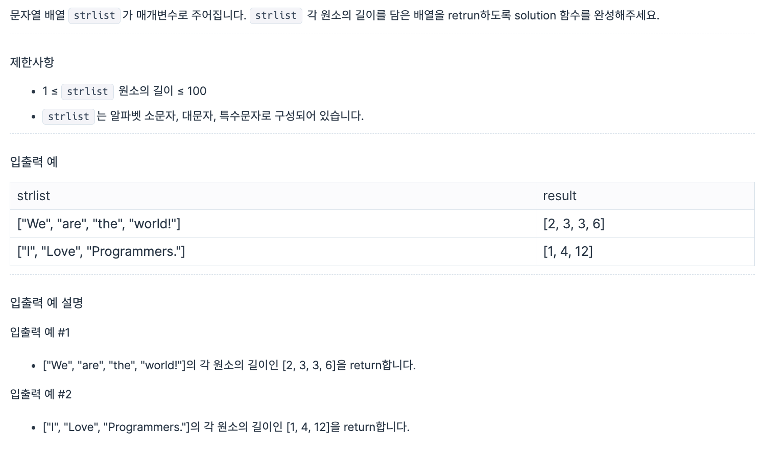 Mission. 작성한 답 function solution(strlist) { const result = strlist.map(str => str.length); return result; } 참고 자료 https://school.programmers.co.kr/learn/courses/30/lessons/120854