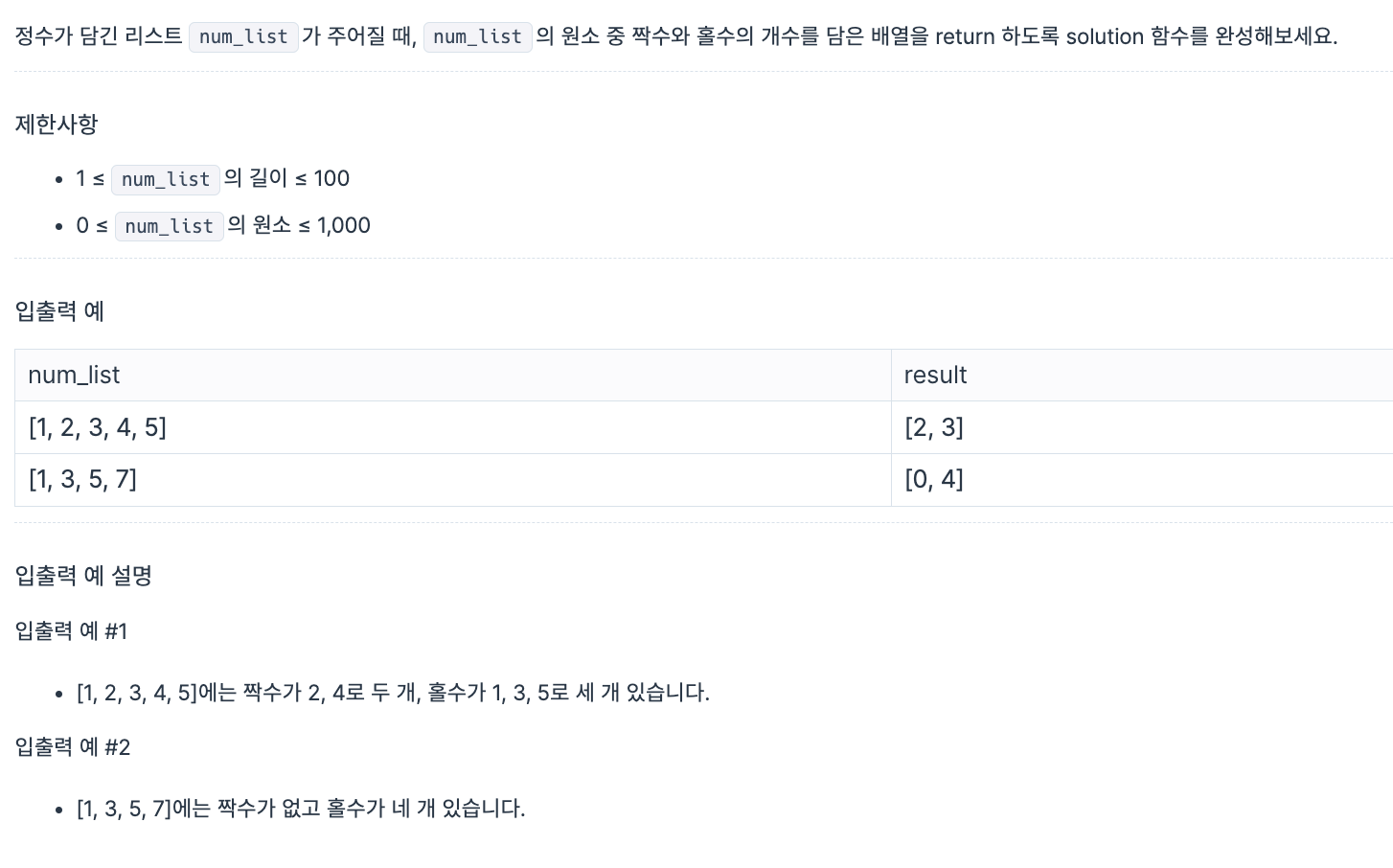 function solution(num_list) { let evenCount = 0; let oddCount = 0; for (let i = 0; i < num_list.length; i++) { if (num_list[i] % 2 === 0) { evenCount++; } else { oddCount++; } } return [evenCount, oddCount]; }참고 자료