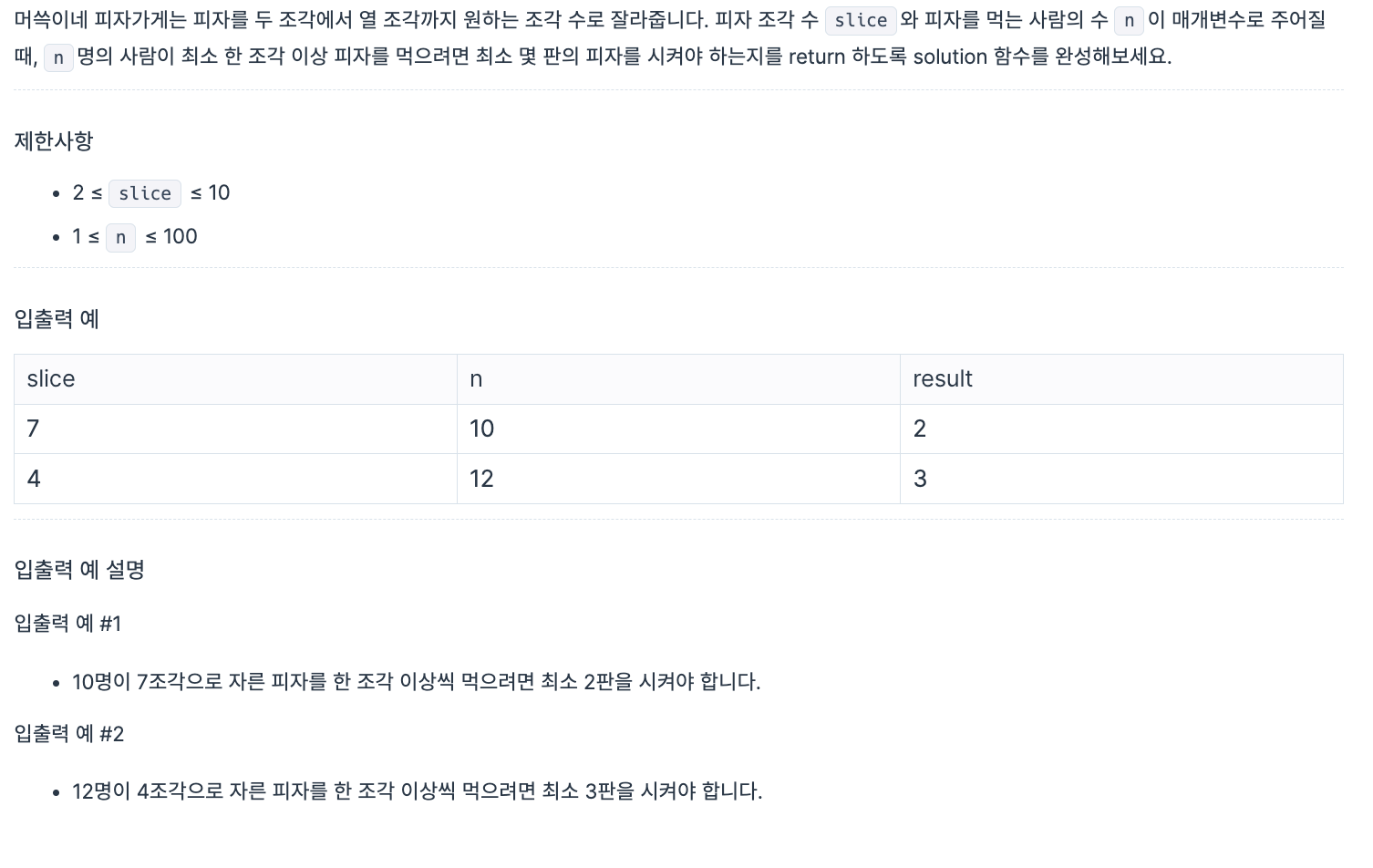 Mission. 작성한 답 function solution(slice, n) { const pizzasNeeded = Math.ceil(n / slice); return pizzasNeeded; } 참고 자료 https://school.programmers.co.kr/learn/courses/30/lessons/120816