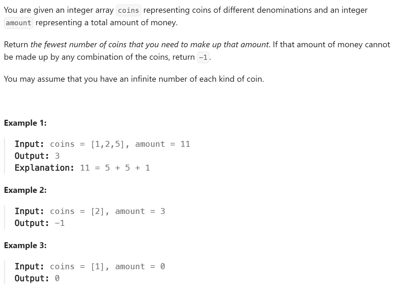 coins 배열 안에 있는 값들로 amount를 만들어야 하는데 가장 적은 개수를 사용해 만드는 문제