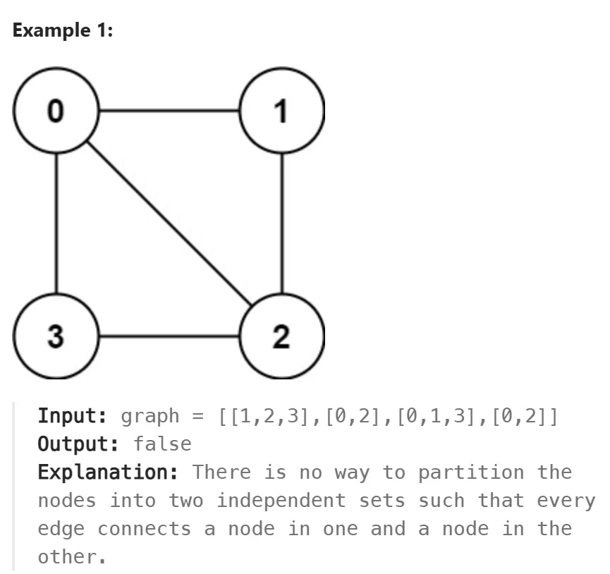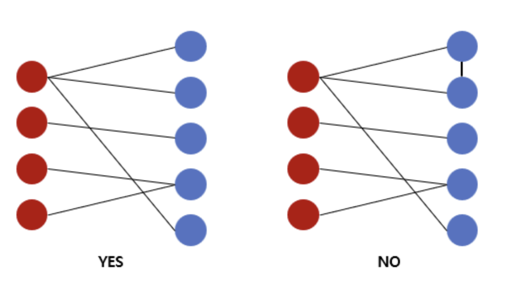 예를 들어 왼쪽 그룹을 빨강, 오른쪽 그룹을 파랑으로 칠한다고 가정했을 때 연결된 두 노드에 같은 색깔이 칠해진다면 이분 그래프가 아님!