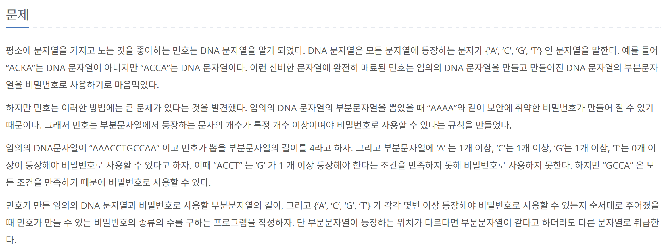 길이가 S인 문자열에서 길이가 P인 부분 문자열을 추출해 비밀번호를 만들 것인데, 이 문자열 안에 포함된 A, C, G, T의 개수가 주어진 조건 이상이어야 유효한 비밀번호로 인정된다. 이 유효한 비밀번호가 몇 개 나오는지를 찾는 문제