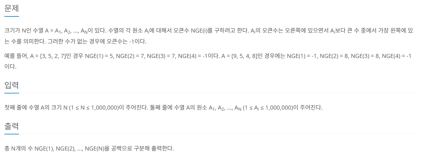 수열 A가 주어졌을 때 A의 각 원소에 대해 오큰수를 구하는 문제
