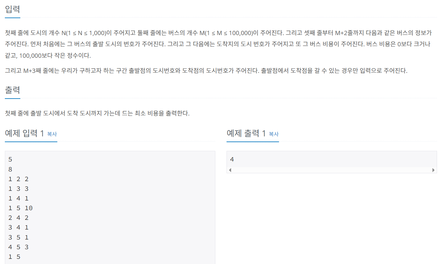 시작점에서 도착점으로 가는 최소 비용을 구하는 문제
